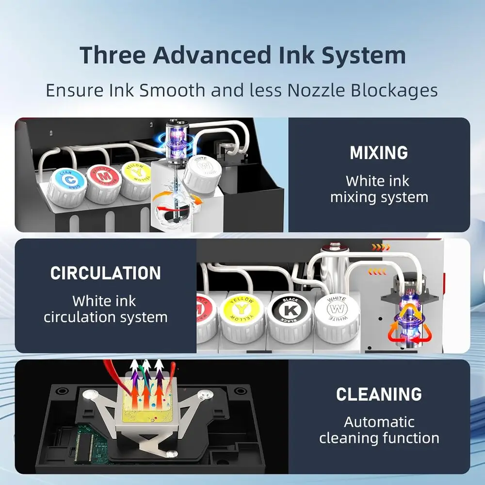 Regular nozzle cleaning and white ink circulation are necessary to prevent clogging and maintain print quality.