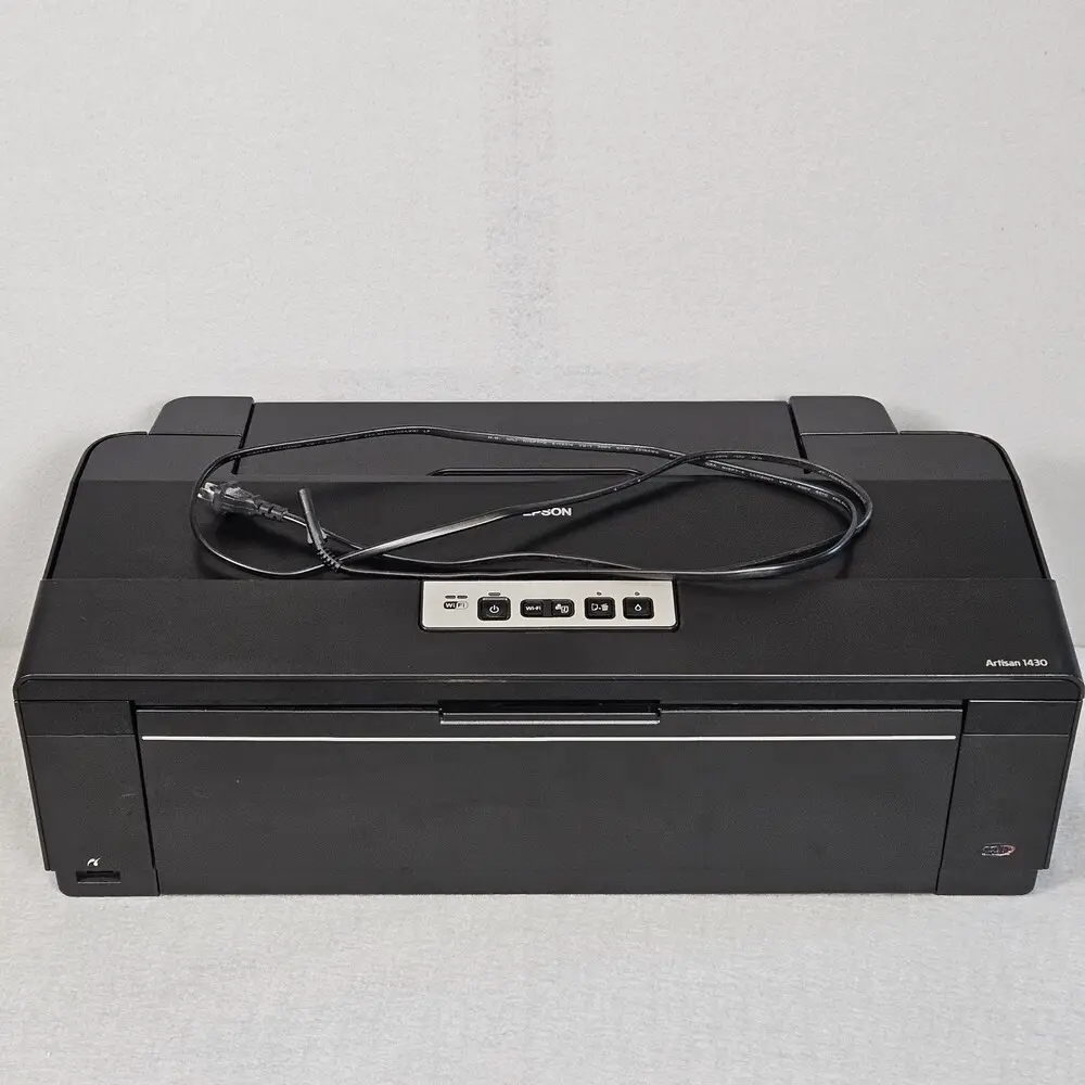 The Artisan 1430 lacks wireless connectivity options, requiring cable connection for printing, which may limit convenience in modern workspaces. Print speeds can be relatively slow when printing at the highest quality settings or on large media sizes. It does not support automatic duplex (double-sided) printing, which can increase paper usage. Scanner functionality is not included, necessitating a separate device for digital image capture. The ink cartridges can be costly, and using third-party inks may compromise print quality and longevity. Firmware and driver updates have been discontinued, potentially causing compatibility issues with newer operating systems.