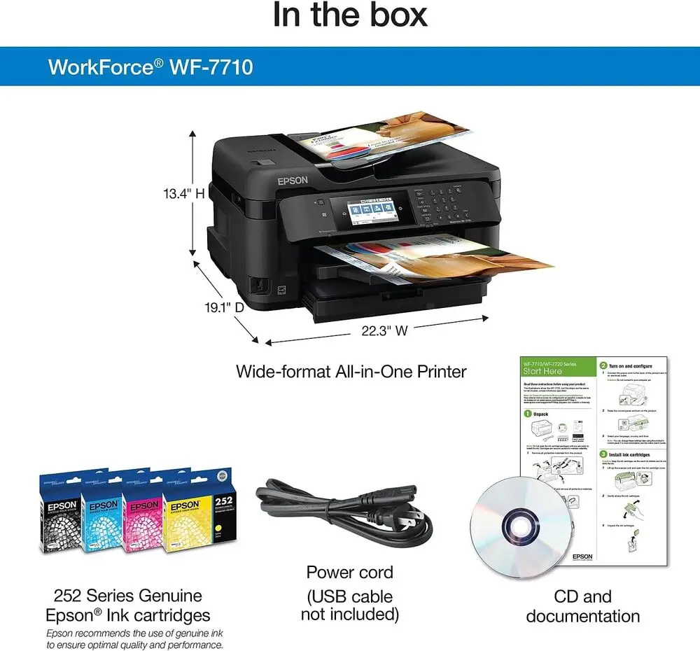 Included Components | 4x DURABrite Ultra Ink cartridges (1x Black ink cartridge and 3x color ink cartridges: 1x Cyan, 1x Magenta, 1x Yellow)., WorkForce WF-7710 all-in-one, instruction manual, power cord |