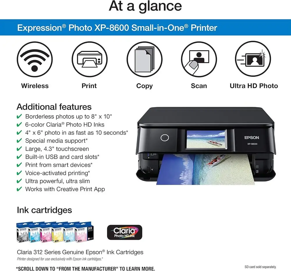 Included Components | Expression Photo XP-8600 Small-in-One printer, CD-ROM for product setup, power cord, 6x Claria Photo HD Ink cartridges9 (1x Black, 1x Cyan, 1x Magenta, 1x Yellow, 1x Light Cyan, 1x Light Magenta) |