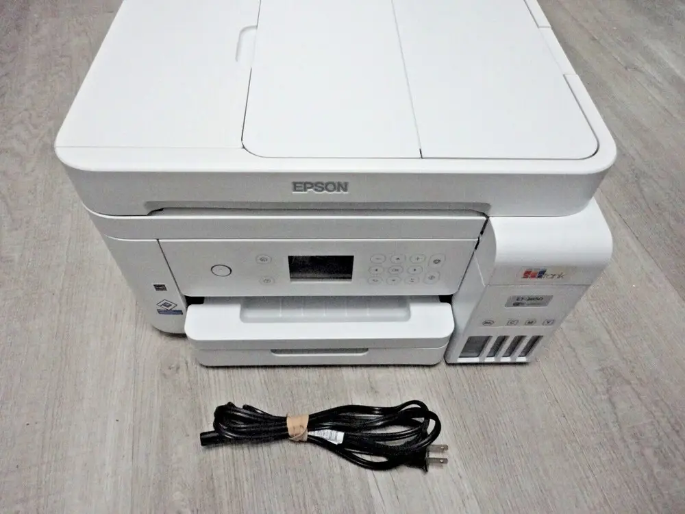 The Epson EcoTank ET-3850 is a multifunction inkjet printer designed for office use, featuring an integrated refillable ink tank system that reduces the cost per page compared to traditional cartridge printers. It supports printing, scanning, copying, and faxing functionalities, making it a versatile device for small to medium-sized office environments. The printer delivers a maximum print resolution of up to 5760 x 1440 optimized dpi, producing clear text and vibrant images. It supports various connectivity options including USB, Ethernet, and Wi-Fi, allowing flexible setups and mobile printing through Epson’s iPrint app and AirPrint. The device uses Epson’s DURABrite Ultra pigment ink technology, ensuring smudge, fade, and water-resistant prints. Its compact design and relatively quiet operation add to its suitability for office conditions where space and noise considerations matter.