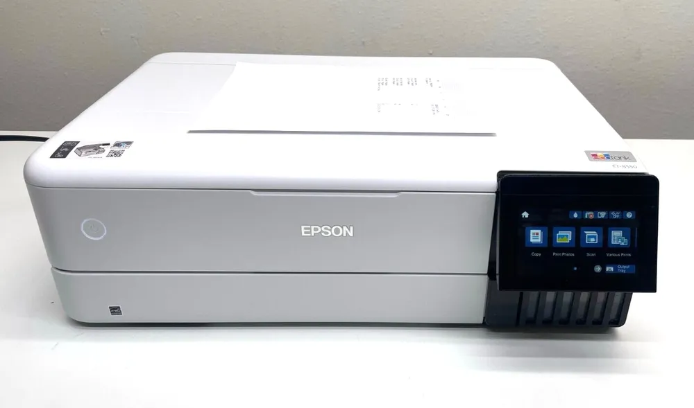The Epson EcoTank Photo ET-8550 is a wide-format inkjet printer designed for high-quality photo printing with a six-color Claria Photo HD ink system including red and gray inks that enhance color accuracy and tonal range.
