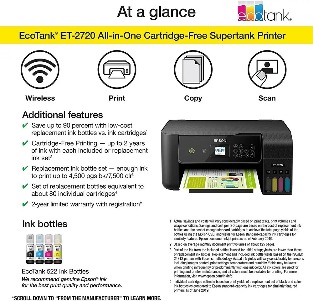 Its compact size and integrated ink tanks make the ET-2720 an eco-friendly solution by minimizing waste and lowering printing costs.