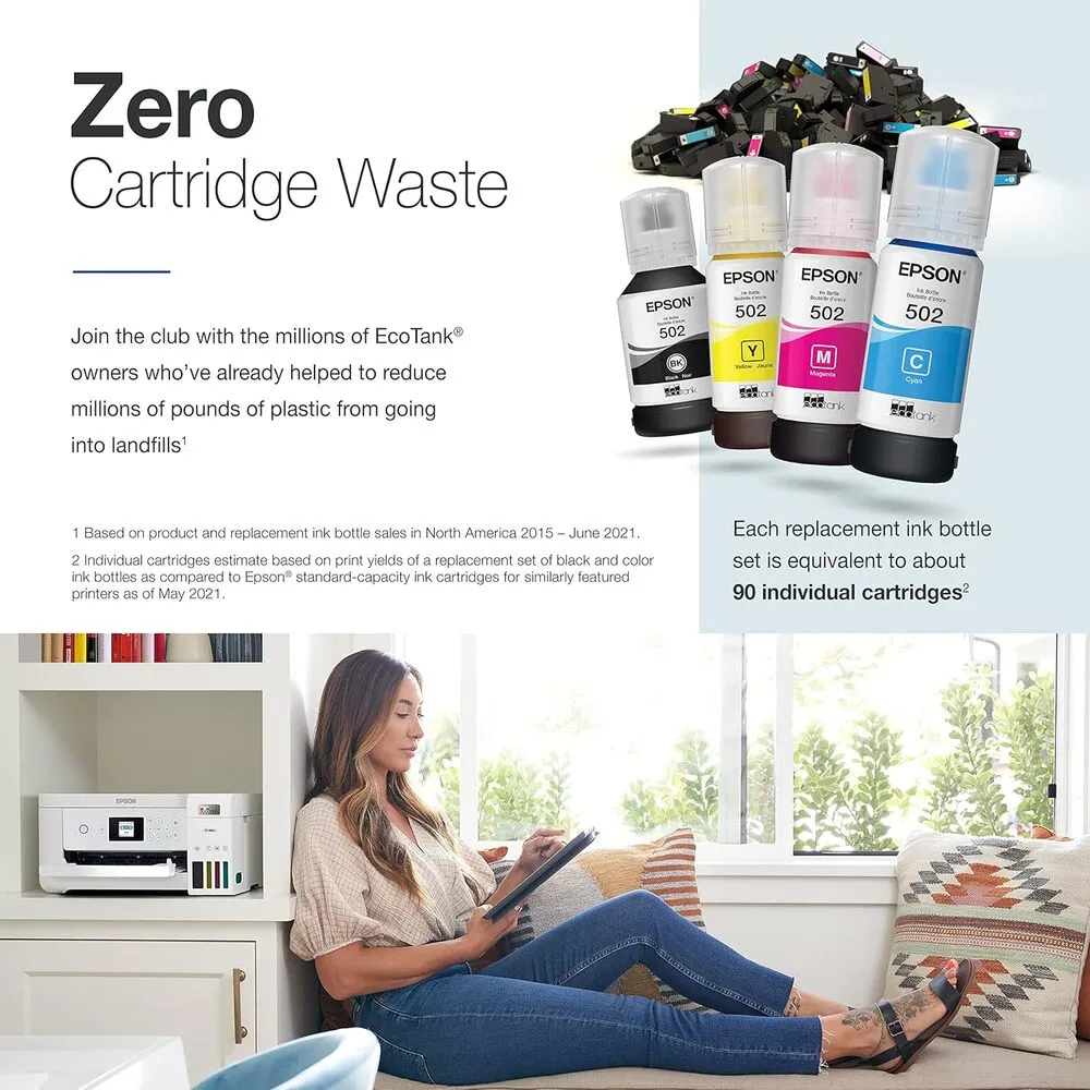 The ET-2850 offers exceptional cost savings by replacing traditional cartridges with refillable ink tanks, significantly lowering the cost per page. Its wireless capabilities facilitate flexible, hassle-free printing from multiple devices without the need for cables. The compact design allows it to fit comfortably in small spaces, making it ideal for personal or small office use. High print resolution ensures professional-quality photos and documents. The all-in-one functionality streamlines office workflows by integrating printing, scanning, and copying into a single device. Additionally, Epson's DURABrite Ultra Ink provides smudge-resistant and water-resistant prints ensuring longevity of documents.
