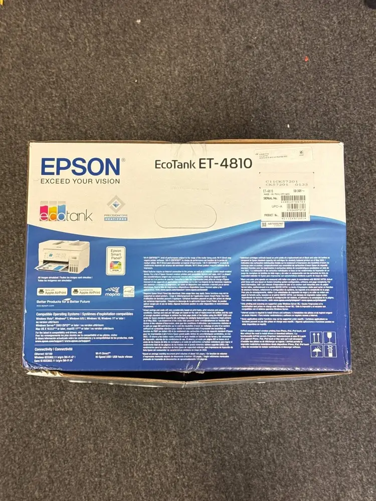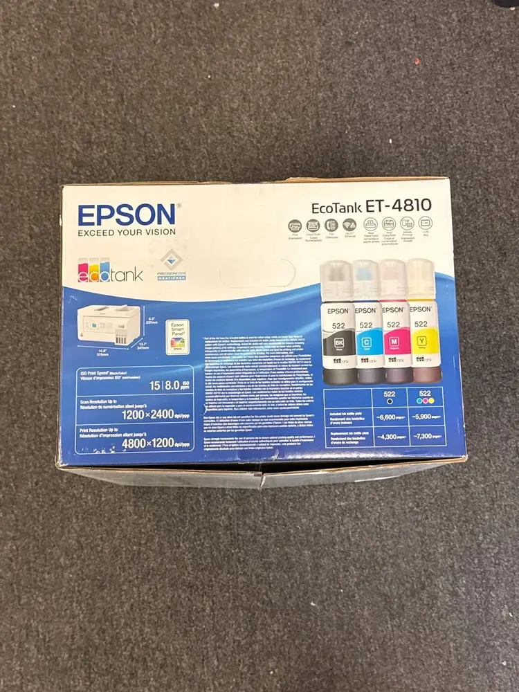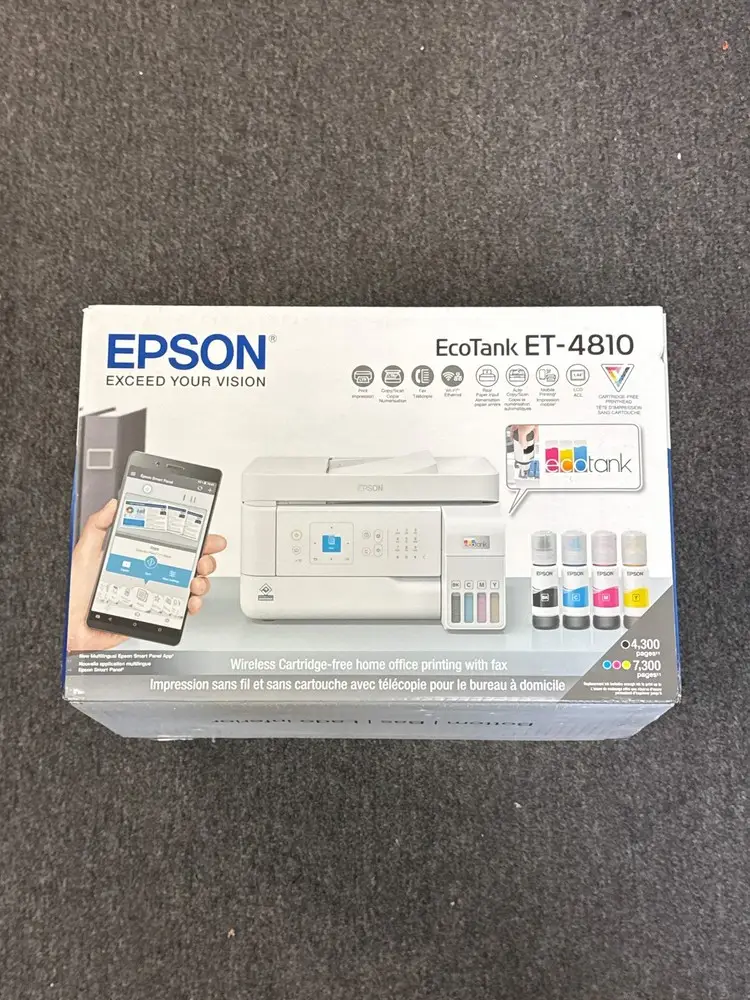 The Epson ET-4810 is an all-in-one color inkjet printer designed primarily for office environments requiring efficient and cost-effective printing. It integrates a refillable EcoTank system that significantly reduces ink costs and supports high-volume printing. The printer supports wireless connectivity including Wi-Fi and Wi-Fi Direct for seamless mobile and cloud printing capabilities. It offers print speeds up to 10 pages per minute for black and white, and 5 pages per minute for color, meeting moderate office productivity demands. The device features a 30-sheet automatic document feeder enabling effective scanning and copying functions. Compatibility with various paper sizes and types makes it versatile for multiple office tasks.
