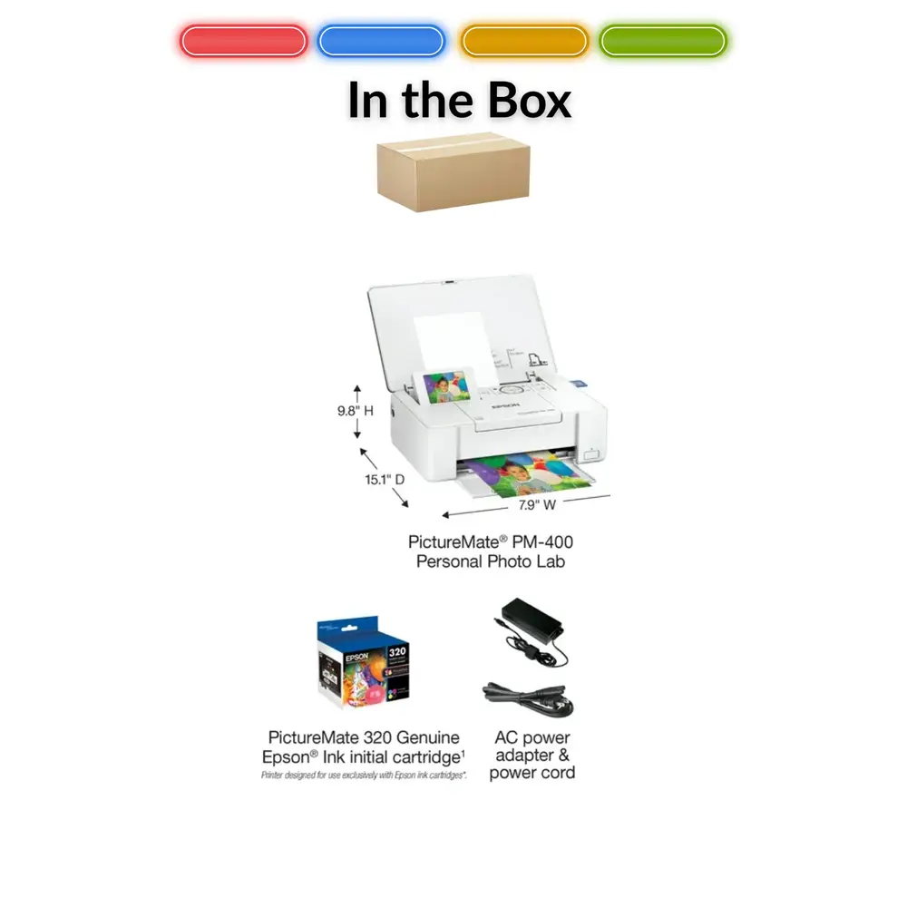 Connectivity is straightforward with USB 2.0 interface, and the printer accepts various popular photo paper formats. Its compact size and light weight make it ideal for portable photo printing, while included software enhances usability. The PictureMate PM-400 is designed to provide reliable photo print quality outside of traditional desktop printer setups, focusing on color accuracy and sharp images.