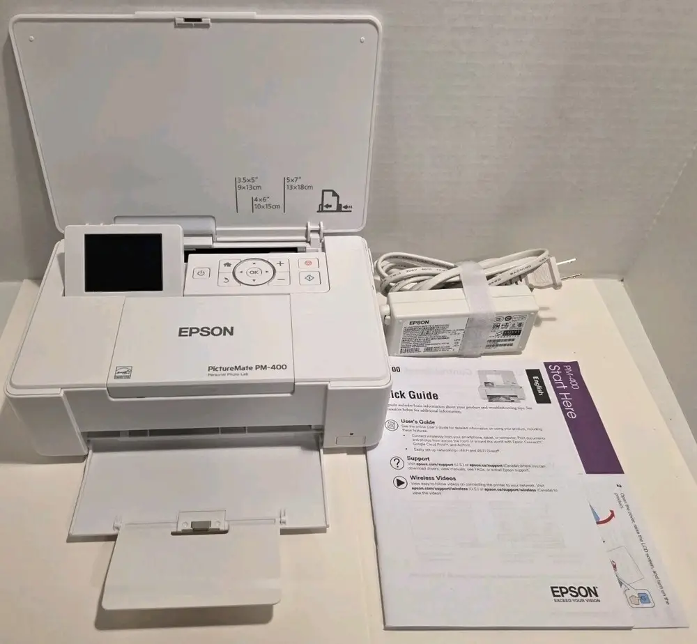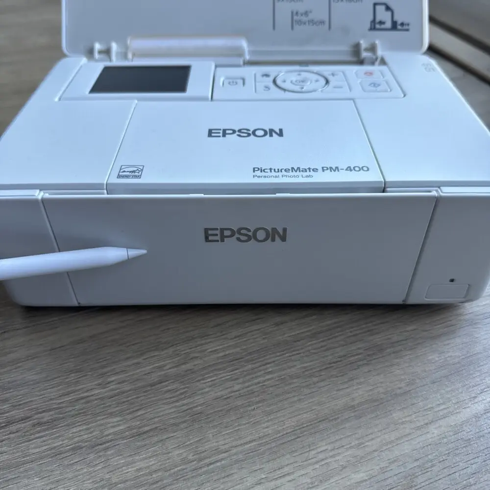 The Epson PictureMate PM-400 is a compact, wireless photo printer designed for high-quality photo printing with vibrant colors and crisp detail. It features a 576 nozzles MicroPiezo print head that delivers precise droplet placement for superior photo output. The printer supports printing sizes up to 4" x 6" and includes a built-in 2.7-inch color LCD for photo preview and easy navigation. Connectivity options include Wi-Fi and direct printing from smartphones and cameras via Wi-Fi Direct and PictBridge. It utilizes Epson's DURABrite Ultra pigment inks known for water-resistant, smudge-proof, and fade-resistant prints. The device is powered by a 6-color ink system, enhancing color accuracy and richness for professional-grade photos.