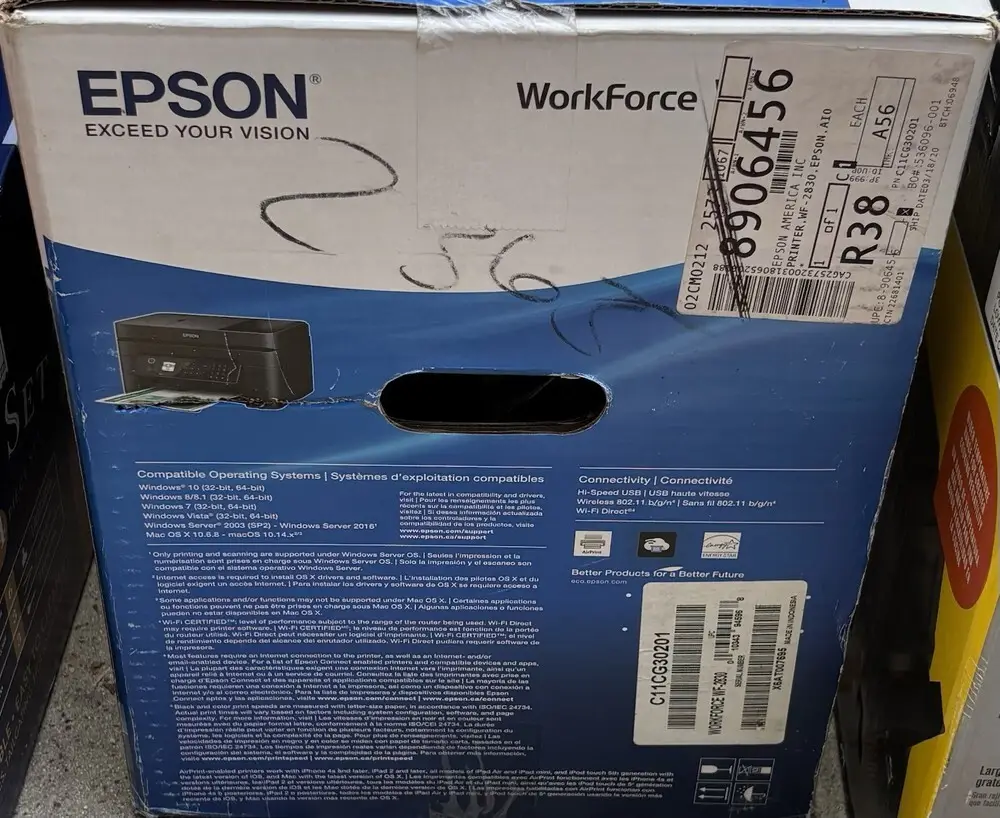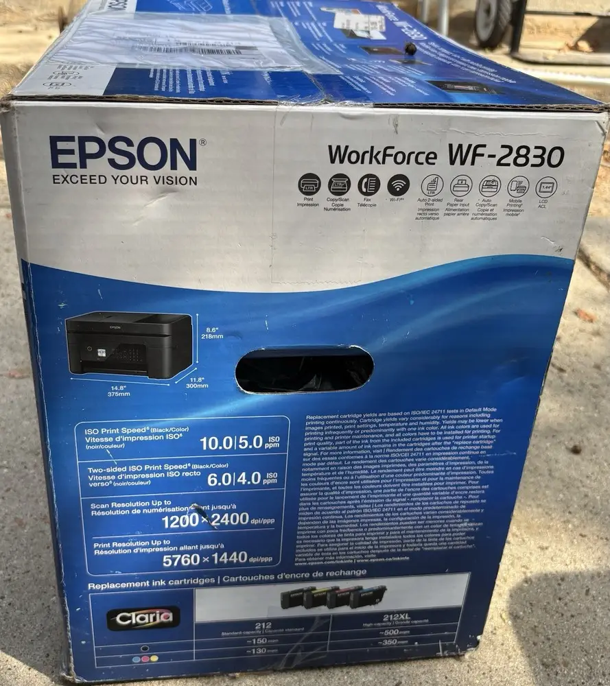Included Components | WorkForce WF-2830 printer, instruction booklets, CD-ROM with drivers, power cord, 4 Claria Ink cartridges (1x Black ink cartridge and 3x color ink cartridges: 1x Cyan, 1x Magenta, 1x Yellow) |