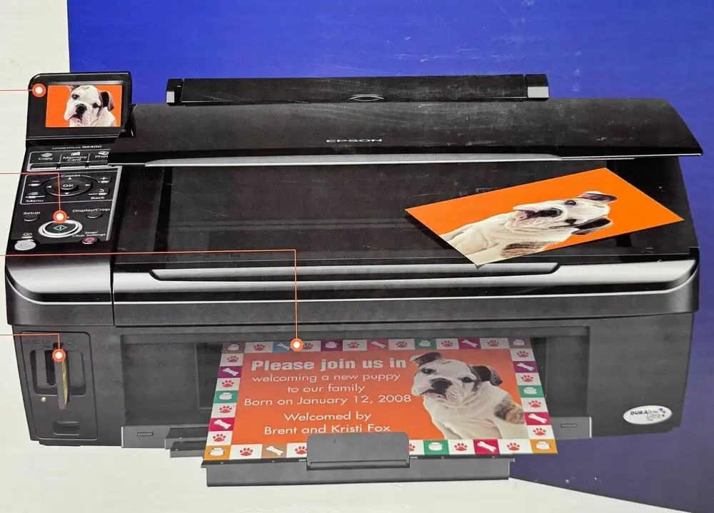 The maximum print resolution is 5760 x 1440 optimized dpi with Epson Micro Piezo technology.