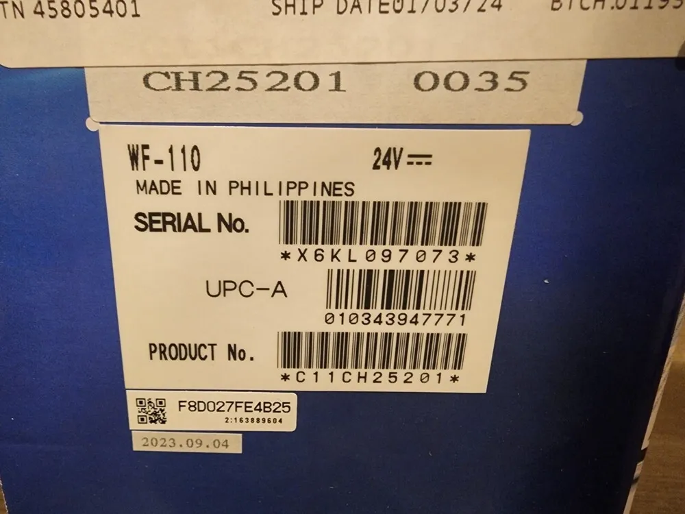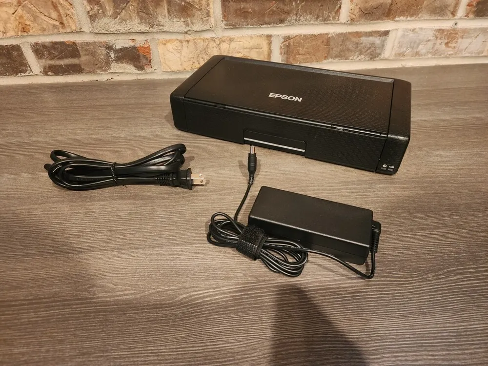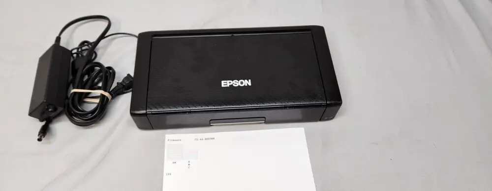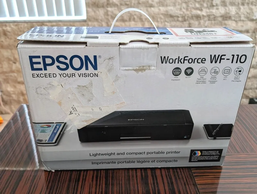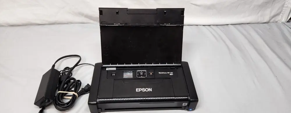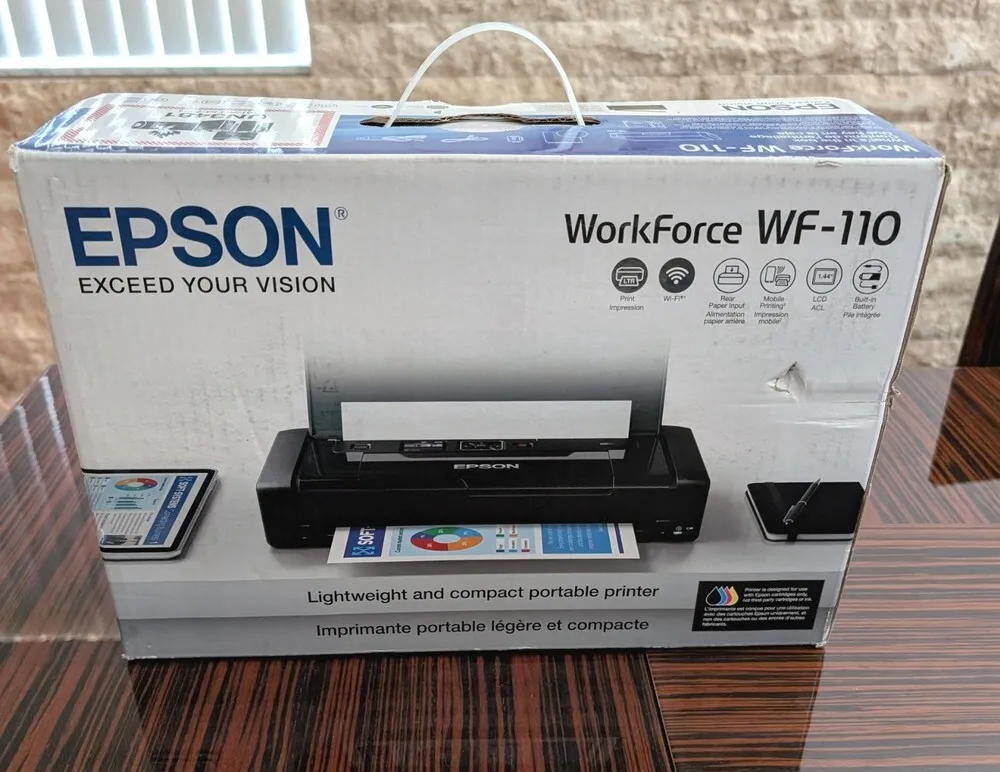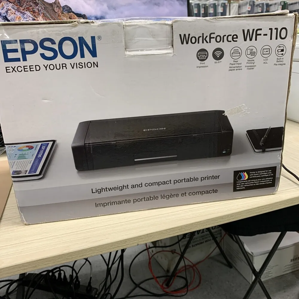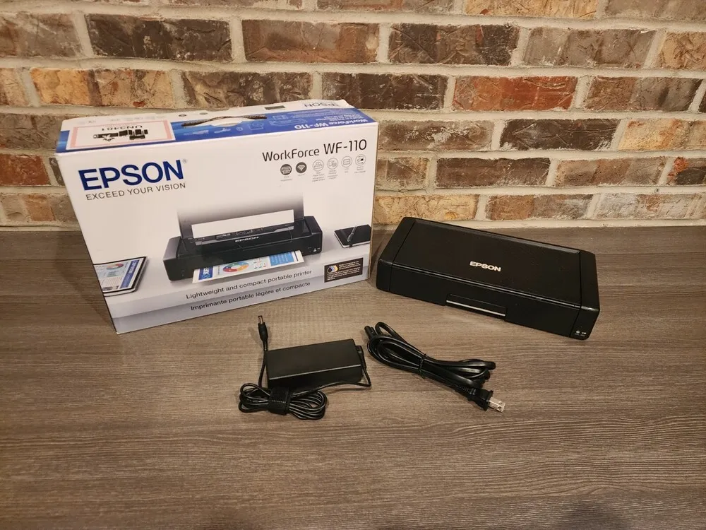The Epson Workforce WF-110 is a compact, mobile inkjet printer designed for users who require printing capabilities on the go. It features wireless connectivity including Wi-Fi Direct, enabling seamless printing from smartphones, tablets, and laptops without the need for a network. The printer uses PrecisionCore technology to deliver efficient and high-quality print output. It supports color and black-and-white printing at resolutions up to 5760 x 1440 optimized dpi. The device is powered via a rechargeable lithium-ion battery, making it highly portable and convenient for mobile professionals. Its overall dimensions and lightweight design contribute to easy transportation, facilitating printing in various locations.