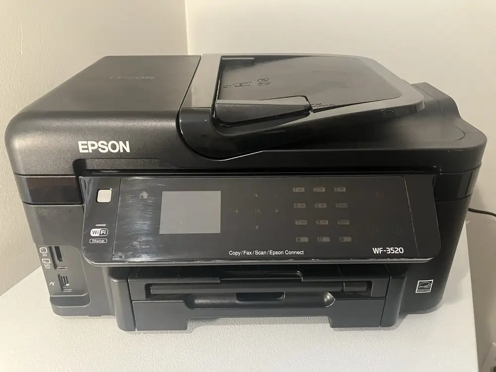 The Epson WorkForce WF-3520 is a multifunction inkjet printer designed for small offices and home users. It supports printing, scanning, copying, and faxing with a compact footprint. The printer employs Epson's DURABrite Ultra pigment ink technology for crisp text and vibrant color output. It features a 250-sheet paper tray and a 30-sheet automatic document feeder (ADF) for multi-page scanning and copying convenience. The WF-3520 supports USB connectivity and optional Ethernet for network printing. Its print speed reaches up to 13 ppm in black and 6.8 ppm in color, suitable for moderate office workloads.