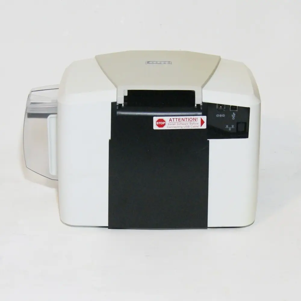 The printer supports only single-sided card printing, limiting certain applications requiring double-sided cards. Its print resolution is capped at 300 dpi, which may not match higher-end models with finer image quality. There is no Ethernet or wireless connectivity option, restricting network integration. The card capacity in the input hopper and output stacker is limited, requiring frequent replenishment for large print jobs. It lacks advanced security features such as smart card encoding. Firmware and driver updates may be limited due to the model's discontinued status.