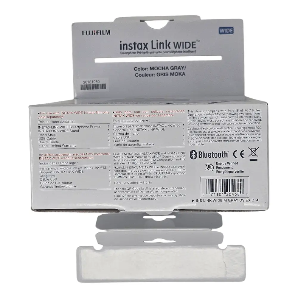 The Fujifilm Instax Link Wide is a portable photo printer designed for instant printing of wide-format photos directly from your smartphone or compatible devices. It utilizes Fujifilm's Instax Wide film format, producing photos at 86mm x 108mm size, larger than the traditional Instax Mini prints. The printer supports wireless connectivity via Bluetooth 4.2, allowing seamless and quick printing from iOS and Android devices using the dedicated Instax Link Wide app. Powered by a rechargeable lithium-ion battery, it offers compactness and mobility for on-the-go photo printing. The printer integrates advanced printing technology to deliver sharp, vibrant, and high-quality color photos with rapid print speed. Its user-friendly interface and customizable print options provide enhanced control over photo output.