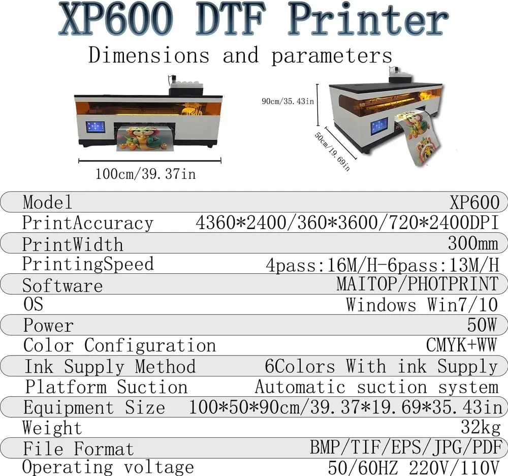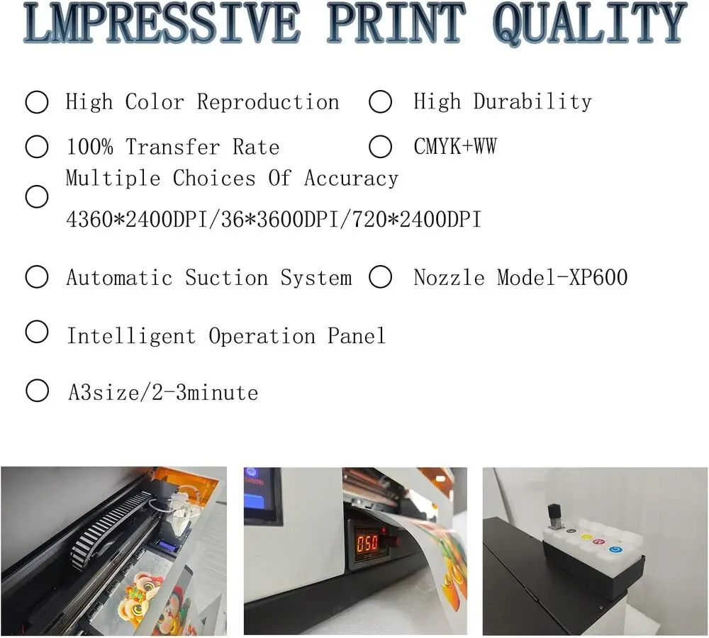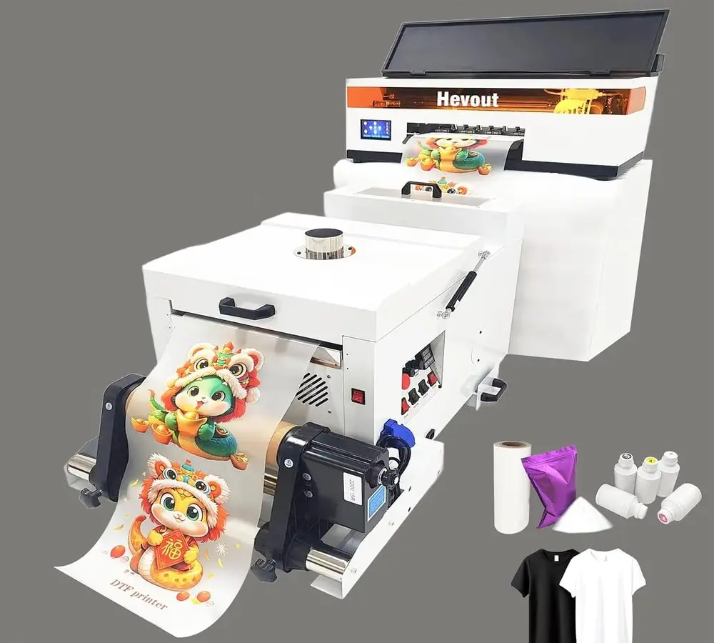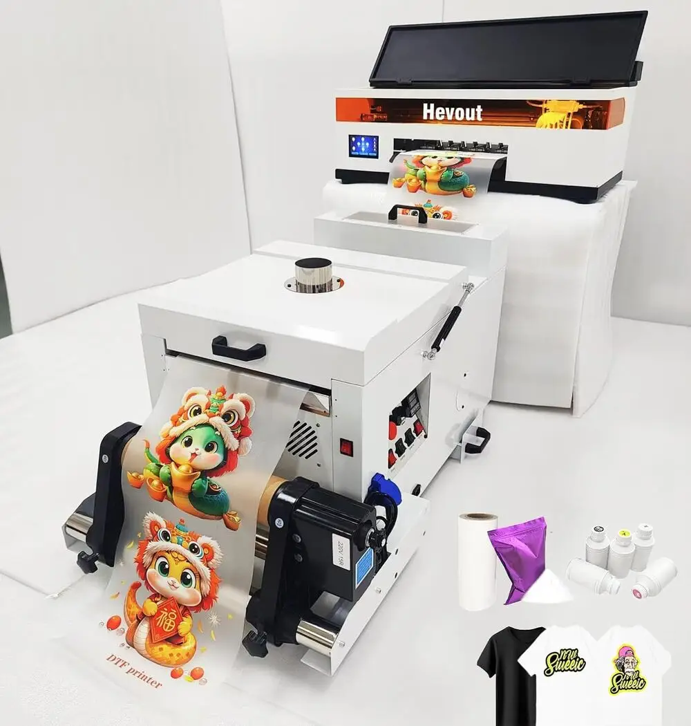 The Hevout A3-XP600 uses XP600 printhead technology combined with InkSonic direct-to-film (DTF) printing technology to produce detailed and durable prints.