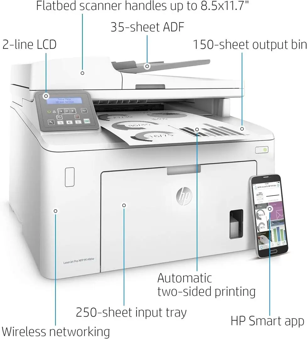 The device supports only black and white printing, limiting color document production. Print resolution of 600 x 600 dpi may not satisfy high-resolution graphic requirements. The paper input capacity is relatively low, requiring frequent reloading for large print jobs. Lack of Wi-Fi or mobile printing capabilities limits flexible printing options. The scanner is flatbed with modest scanning speed, which may slow high-volume digitization efforts. It does not support advanced finishing features such as duplex printing in automatic mode or stapling, reducing convenience for complex document handling.