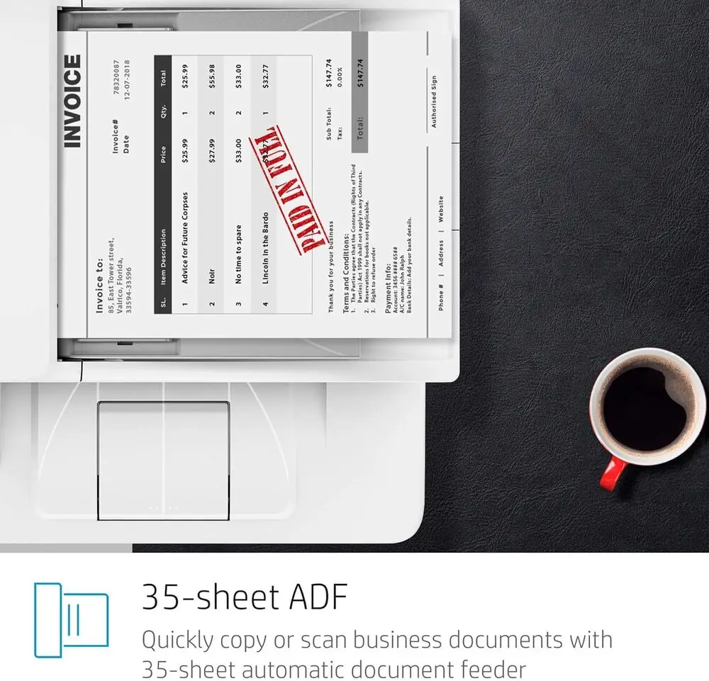 HP 4PA41A offers multifunction capabilities in a compact footprint, ideal for office desktops with limited space. The monochrome laser printing ensures fast print speeds with crisp, reliable output for professional documents. Network connectivity allows easy sharing among multiple users enhancing office collaboration. Automatic document feeder streamlines multi-page scanning and copying, saving time on repetitive tasks. Energy-efficient design reduces power consumption and lowers operational costs. HP branding assures availability of quality consumables and support services, providing a dependable device lifecycle.
