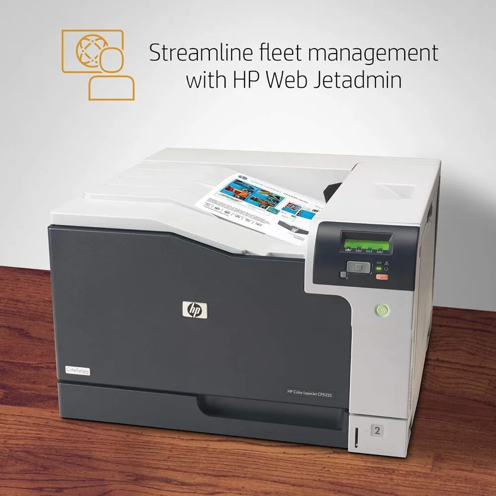 The HP LaserJet 230 CP5225n is a color laser printer designed for office environments requiring reliable, high-volume printing. It features a print resolution of up to 1200 x 1200 dpi, which enables sharp text and vibrant color output. The printer supports network connectivity via an integrated 10/100Base-TX Ethernet port, allowing easy sharing across multiple users. It is powered by a 450 MHz processor and has 128 MB RAM, expandable to 384 MB, supporting complex print jobs efficiently. The device can print at speeds up to 20 pages per minute in both color and black & white. Standard input capacity is 500 sheets, with additional trays available to increase total input capacity for high-volume needs.