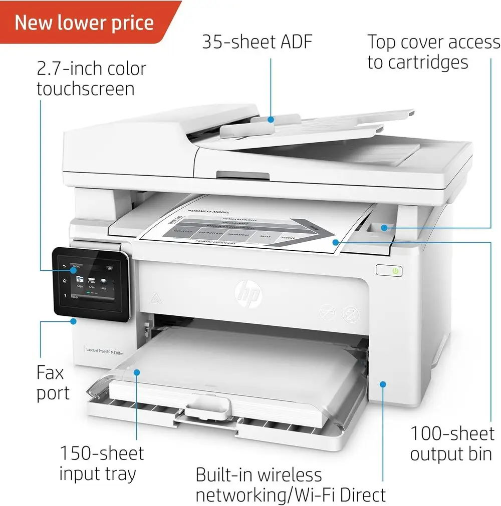 The HP LaserJet Pro M130FW is an all-in-one monochrome laser printer tailored for small office environments, integrating printing, scanning, copying, and faxing features into a compact device. It utilizes HP's proprietary laser printing technology, offering a maximum print resolution of 600 x 600 dpi for sharp, clear text output. The device supports a monthly duty cycle of up to 10,000 pages, making it suitable for moderate volume printing needs. Connectivity options include USB 2.0, Ethernet, and wireless networking, enabling flexible installation and remote printing capabilities. Its 4.3-inch intuitive touchscreen display allows for easy navigation of functions and settings. Additionally, the device includes automatic duplex printing to reduce paper usage and enhance efficiency.