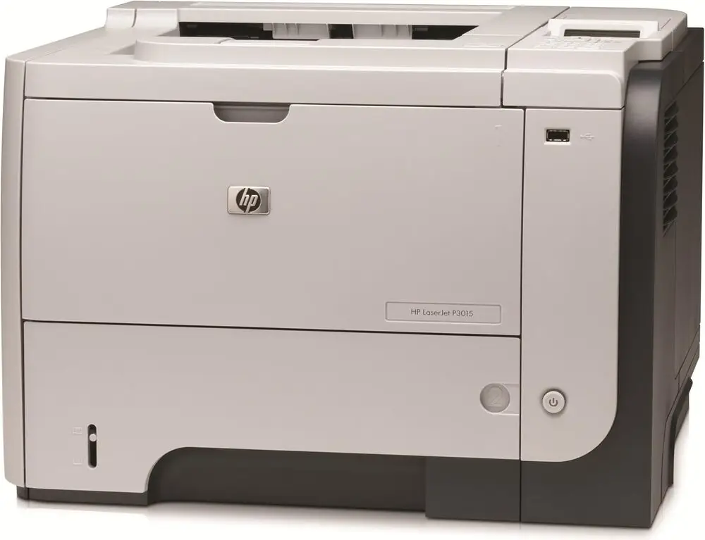 The HP LaserJet P3015N is a monochrome laser printer designed for office environments, providing reliable and high-speed printing performance. It features a 600 MHz processor and 64 MB RAM (expandable), ensuring efficient data processing for complex and high-volume tasks. The printer supports a resolution of up to 1200 x 1200 dpi, delivering sharp and professional-quality documents. It uses HP's LaserJet print technology with a standard print speed of up to 40 pages per minute (ppm). Connectivity options include a built-in 10/100 Base-TX Ethernet network port, facilitating seamless network integration. Its paper capacity includes a 500-sheet input tray expandable to accommodate larger print volumes, making it suitable for medium to large offices.