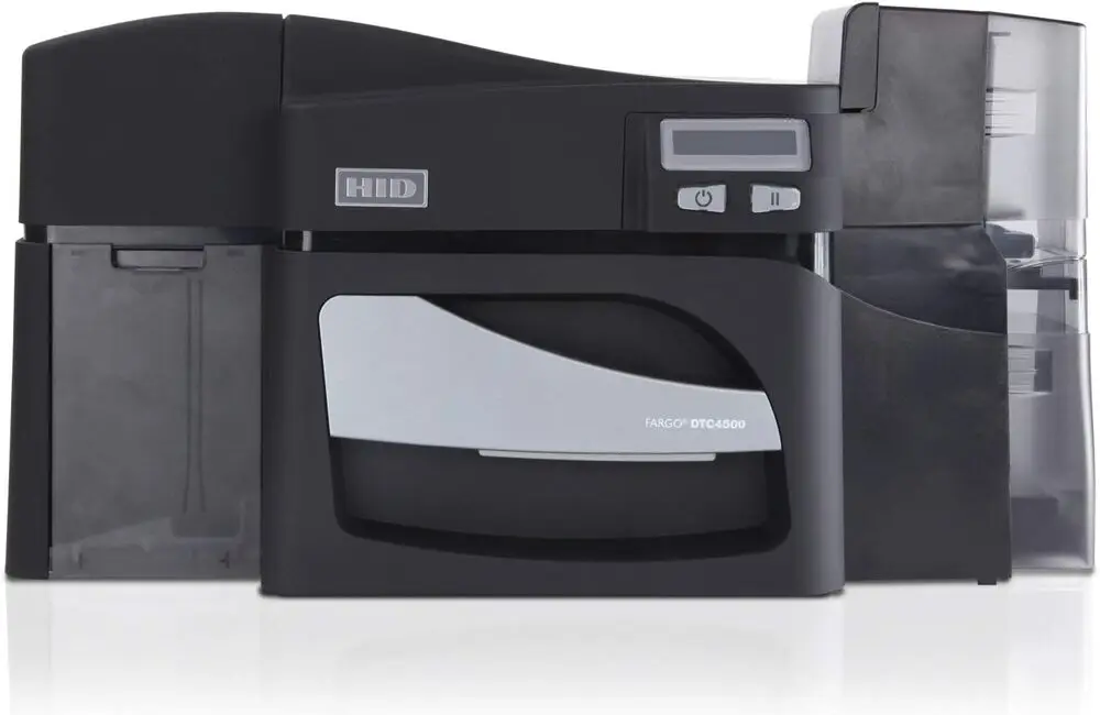 The HID FARGO DTC4500e is a direct-to-card ID badge printer designed for offices requiring high-quality card printing. It utilizes direct dye-sublimation transfer technology combined with resin thermal transfer for printing on a variety of card types. The printer supports monochrome and color printing modes and offers edge-to-edge printing capabilities. It features a print speed of up to 190 cards per hour (monochrome) and approximately 140 cards per hour for full-color single-sided prints. The DTC4500e includes USB connectivity and an optional Ethernet port for network integration. It also supports color dye thermal transfer and monochrome resin thermal transfer ribbons, enhancing print durability.