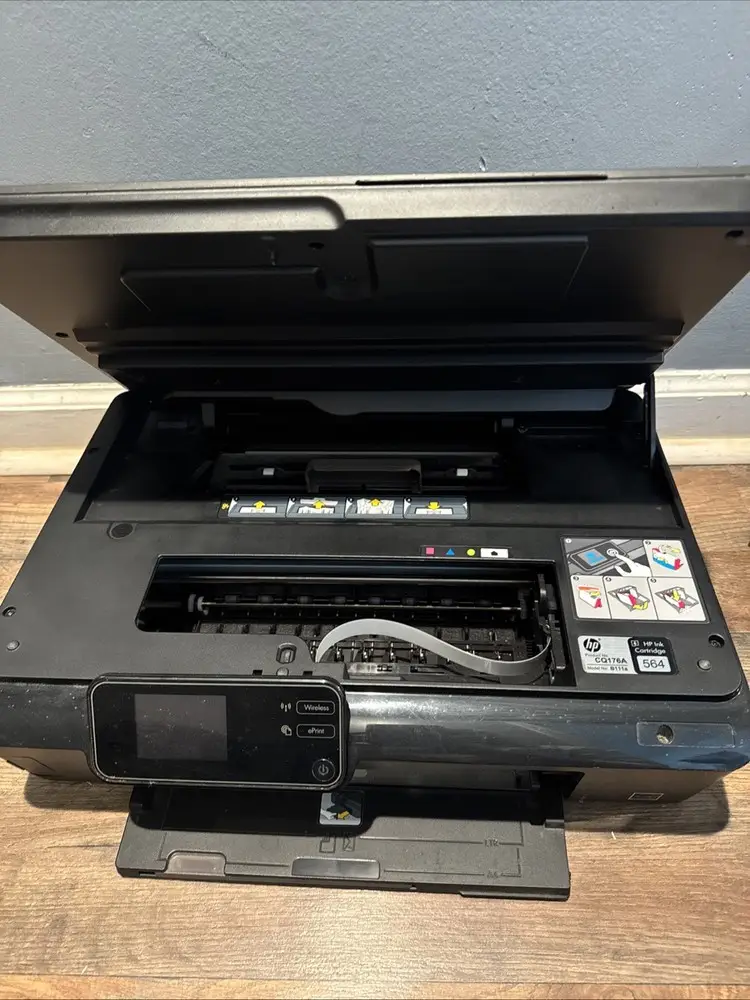 This printer uses HP 564 ink cartridges available in separate black and tri-color versions to manage ink costs efficiently.