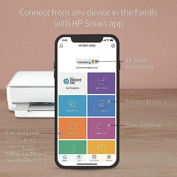 The HP Envy 6052 is praised for its compact and stylish design, fitting well in constrained office environments. Its wireless connectivity enables flexible placement without being tethered by cables. Enhanced mobile printing support allows users to print directly from smartphones and tablets effortlessly. The inclusion of automatic duplex printing contributes to cost and paper savings. Setup is straightforward with the HP Smart App facilitating quick installation and operation. Furthermore, the printer is equipped with individual ink cartridges, enabling economical replacement of only the depleted colors.
