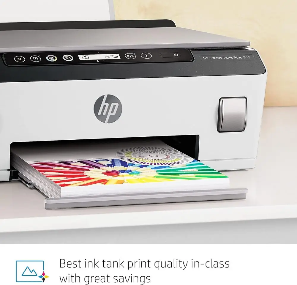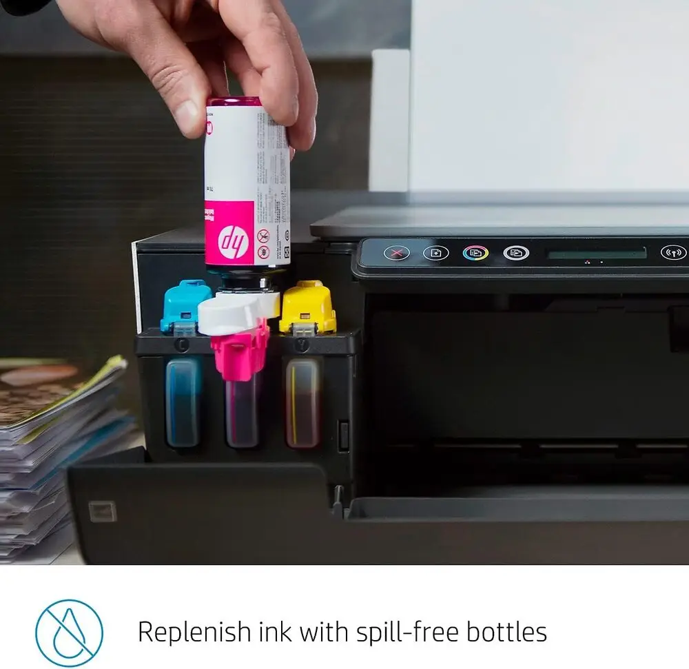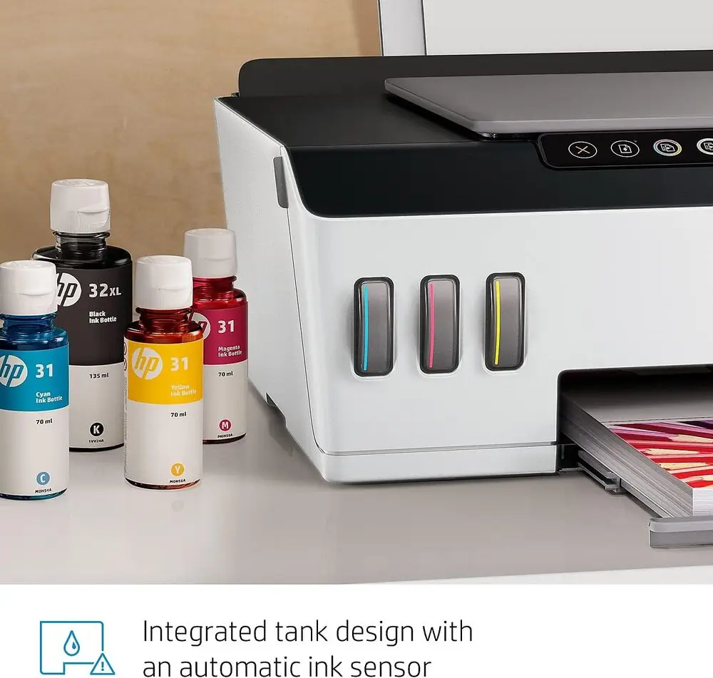 The printer uses HP’s Smart Tank refillable ink system with separate high-capacity ink tanks for each color.