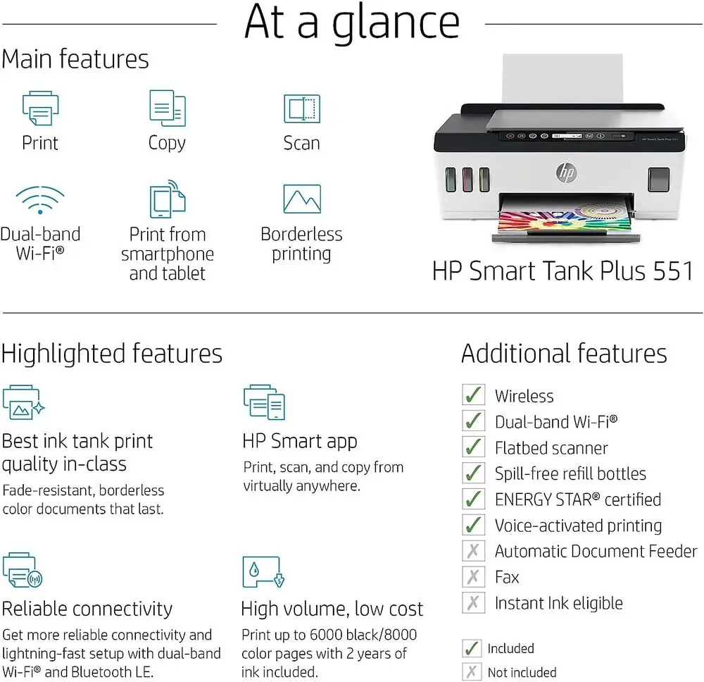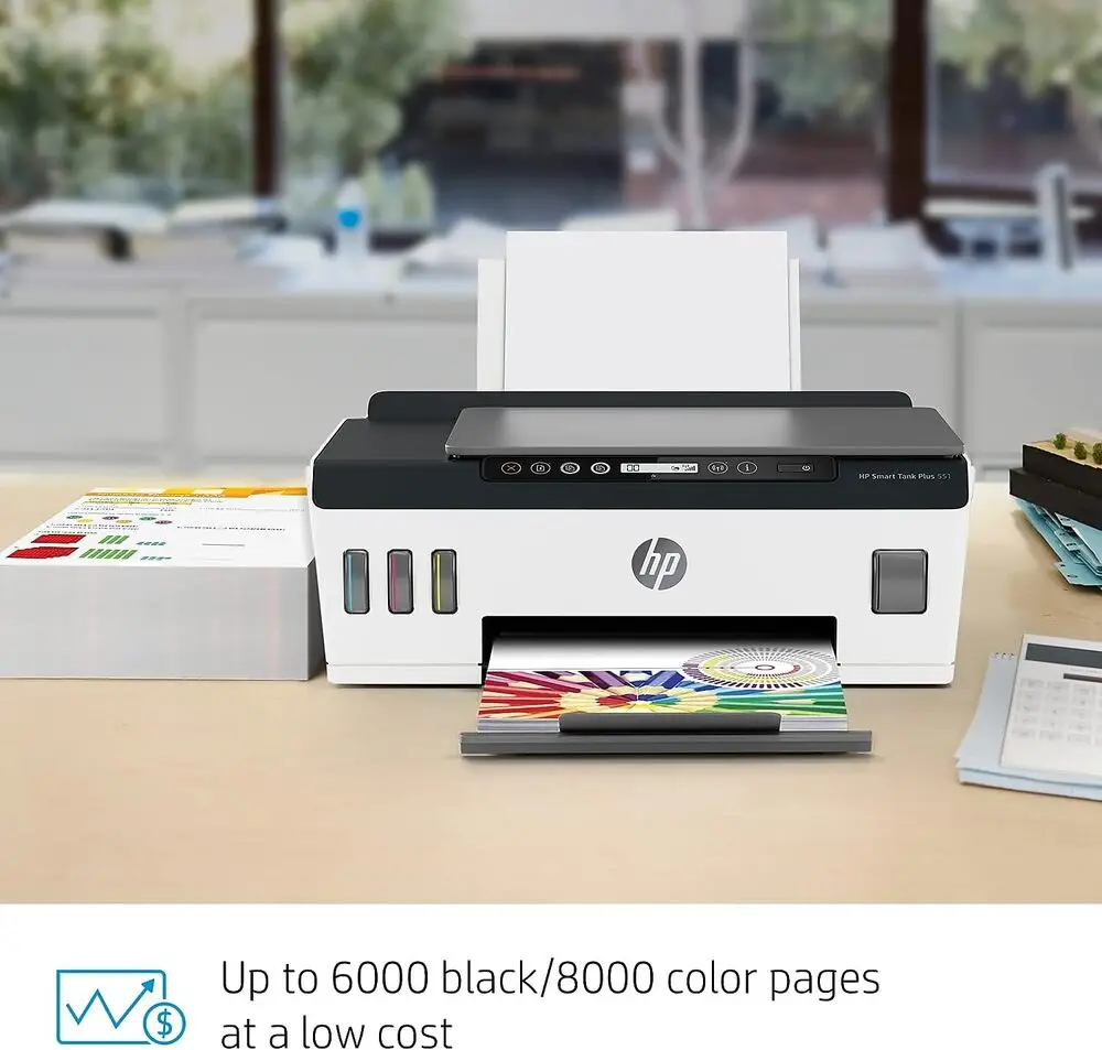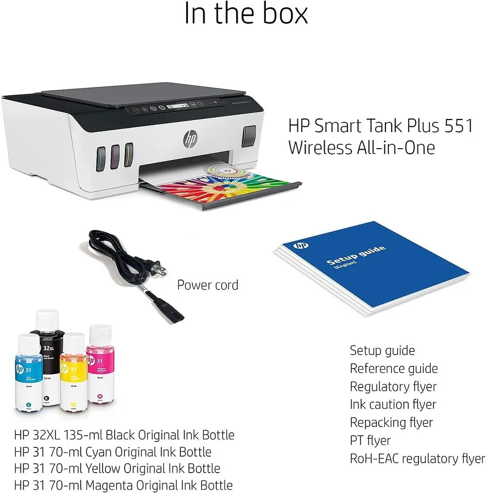 Included Components | 6HF11A HP Smart Tank Plus 551 Wireless All-in-One; HP 32XL 135-ml Black Original Ink Bottle; HP 31 70-ml Cyan Original Ink Bottle; HP 31 70-ml Magenta Original Ink Bottle; HP 31 70-ml Yellow Original Ink Bottle; Ink caution flyer; Repacking flyer; Setup guide; Reference guide; Regulatory flyer; PT flyer; RoHEAC Regulatory flyer; Power cord |