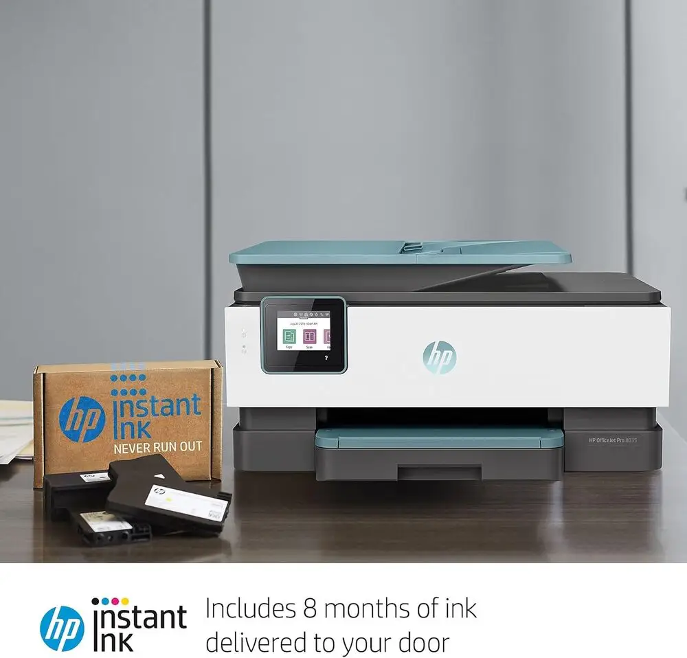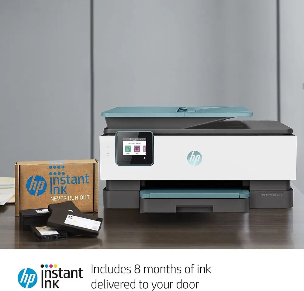 The HP OfficeJet Pro 8035 is an all-in-one inkjet printer designed for small offices and home offices. It features wireless connectivity options such as Wi-Fi, Wi-Fi Direct, and Ethernet, ensuring versatile network integration. The printer supports automatic two-sided printing to reduce paper consumption and increase efficiency. It offers print speeds of up to 20 pages per minute for black and 10 pages per minute for color documents. The device includes a 35-sheet automatic document feeder (ADF) for scanning, copying, and faxing multiple pages quickly. Its 2.65-inch color touchscreen provides an intuitive user interface with easy access to printing functions and settings.