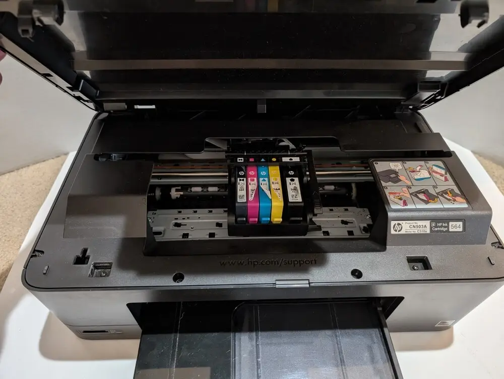 It uses four individual ink cartridges: black, cyan, magenta, and yellow for efficient and quality printing.