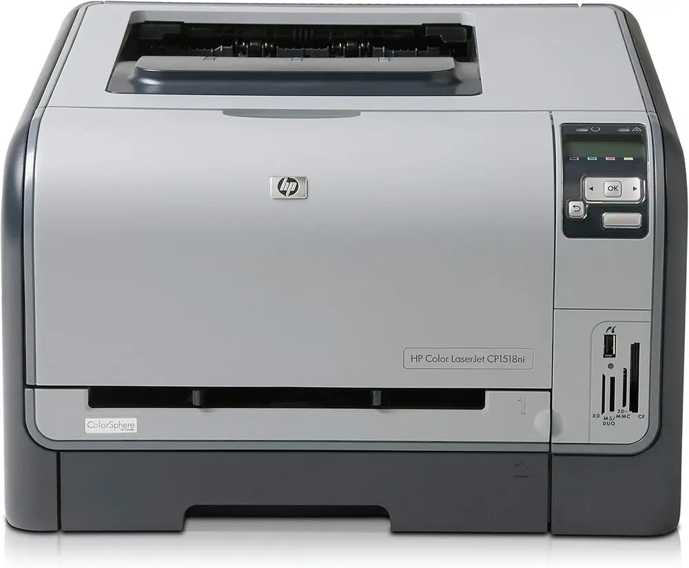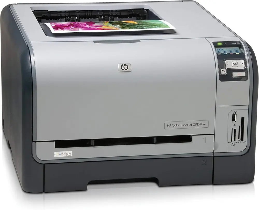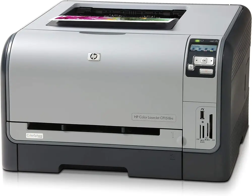 The HP LaserJet CP1518NI (model number CC378A) is a color laser printer designed primarily for office environments, delivering high-quality color prints with laser technology. It operates with a print resolution of up to 600 x 600 dpi, ensuring crisp text and vibrant color output. The device supports a print speed of up to 12 pages per minute for both color and black-and-white documents. Connectivity options include a built-in Ethernet port enabling network sharing and a USB 2.0 port for direct computer connection. The CP1518NI supports a monthly duty cycle of up to 20,000 pages, making it suited for small to medium office workloads. It features a 150-sheet input tray and a 100-sheet output bin, with a compact design optimized for workspace efficiency.
