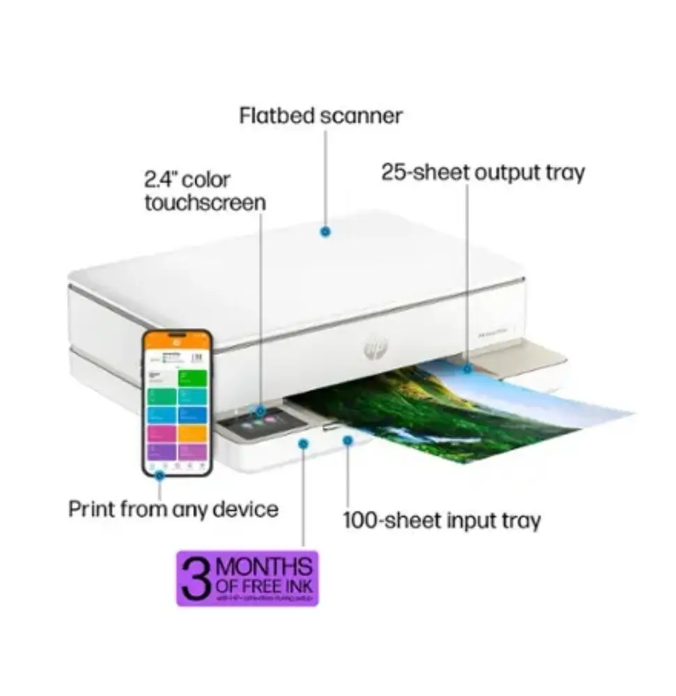 The HP Envy 6458e provides comprehensive all-in-one functionality combining printing, scanning, and copying for efficient office workflows. Its wireless connectivity enhances convenience by supporting mobile device printing through multiple platforms.