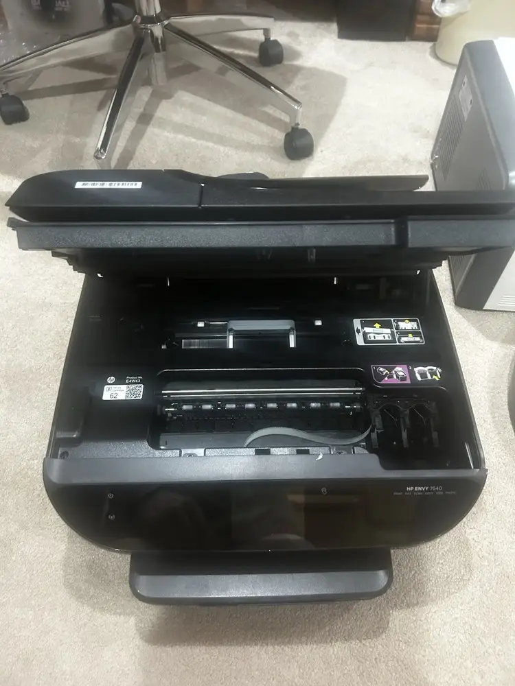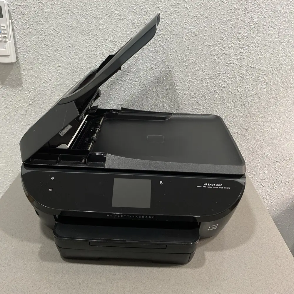 The HP Envy 7640 is an all-in-one inkjet printer designed primarily for home and small office use, integrating print, copy, scan, and fax functions. It supports wireless connectivity via Wi-Fi and Wi-Fi Direct, enabling convenient mobile and remote printing from various devices. The printer uses HP's thermal inkjet technology with a maximum print resolution up to 4800 x 1200 optimized dpi for color printing, offering high-quality photo and document outputs. It features a 2.65-inch color touchscreen for intuitive navigation and control of printer functions. The input tray can hold up to 125 sheets of plain paper, while the automatic document feeder (ADF) has a capacity of 35 sheets for efficient scanning or copying. It supports a range of media sizes and types including photo paper, envelopes, and labels, making it versatile for different printing needs.