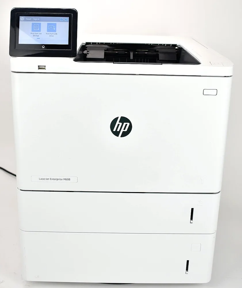 The LaserJet Enterprise M608x delivers fast print speeds enhancing office productivity. Its robust monthly duty cycle supports high-volume printing needs. Advanced security features protect against firmware attacks and unauthorized access. Multiple paper trays increase media versatility and reduce the need for frequent reloading. The use of HP JetIntelligence toner boosts yield and print consistency. The printer supports comprehensive network integration with Ethernet and optional wireless interfaces.