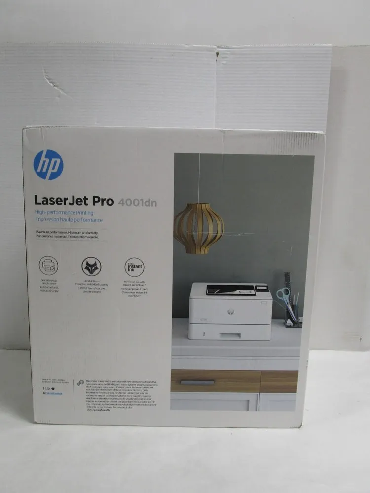 The HP LaserJet Pro 4001dn is a monochrome laser printer designed for small to medium-sized office environments. It offers high-speed printing with a print resolution of up to 1200 x 1200 dpi, ensuring crisp and clear documents. This model supports automatic duplex (double-sided) printing to reduce paper usage and improve workflow efficiency. Connectivity options include Gigabit Ethernet for fast and reliable network integration. The printer is equipped with a 256 MB memory and powered by a 800 MHz processor for efficient task handling. It supports a monthly duty cycle of up to 60,000 pages, suitable for heavy usage in professional settings.