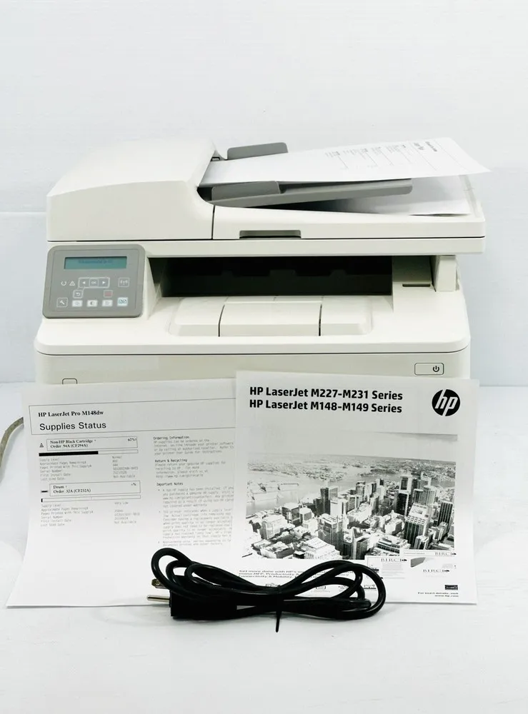 The HP LaserJet Pro M148FDW is a multifunction office printer designed for small to medium business environments. It utilizes a laser printing technology with a robust print engine capable of producing up to 29 pages per minute in black and white. The device supports automatic duplex printing, scanning, copying, and faxing, all managed via an intuitive control panel with a numeric keypad. Connectivity options include Wi-Fi, Ethernet, and USB interfaces, facilitating flexible network integration. Its toner cartridge uses HP 94A or 94X cartridges, optimized for high yield and print quality. The printer supports various media sizes and weights, enhancing its versatility for different office document needs.
