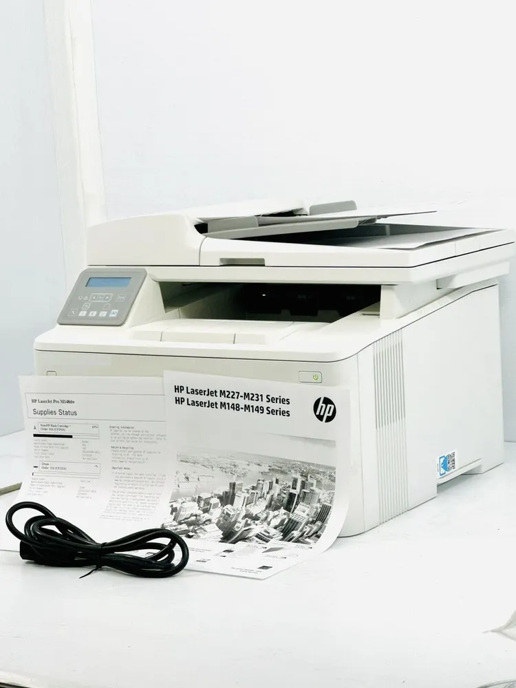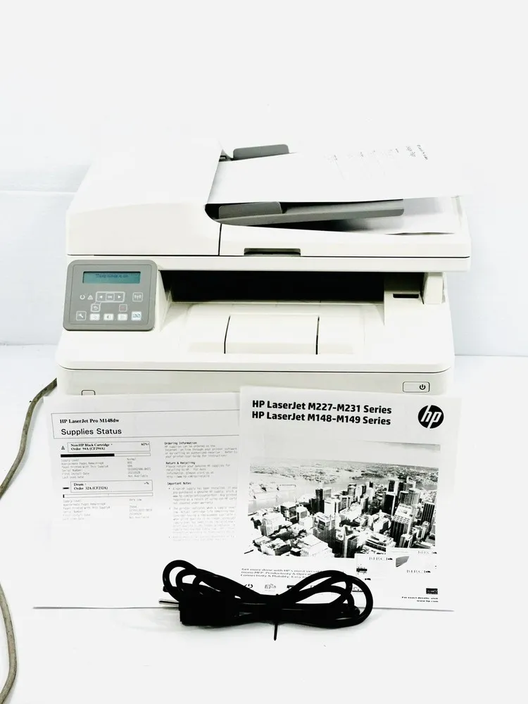 The printer is engineered with energy-efficient features including HP Auto-On/Auto-Off technology to reduce power consumption. Its compact footprint makes it suitable for desk placement in busy workspaces. It includes a 150-sheet input tray and a 100-sheet output bin to handle typical business printing volumes. The M148FDW runs on the HP JetIntelligence platform, providing real-time cartridge status updates and optimized print quality. It comes with a 256MB memory buffer for processing complex documents swiftly.