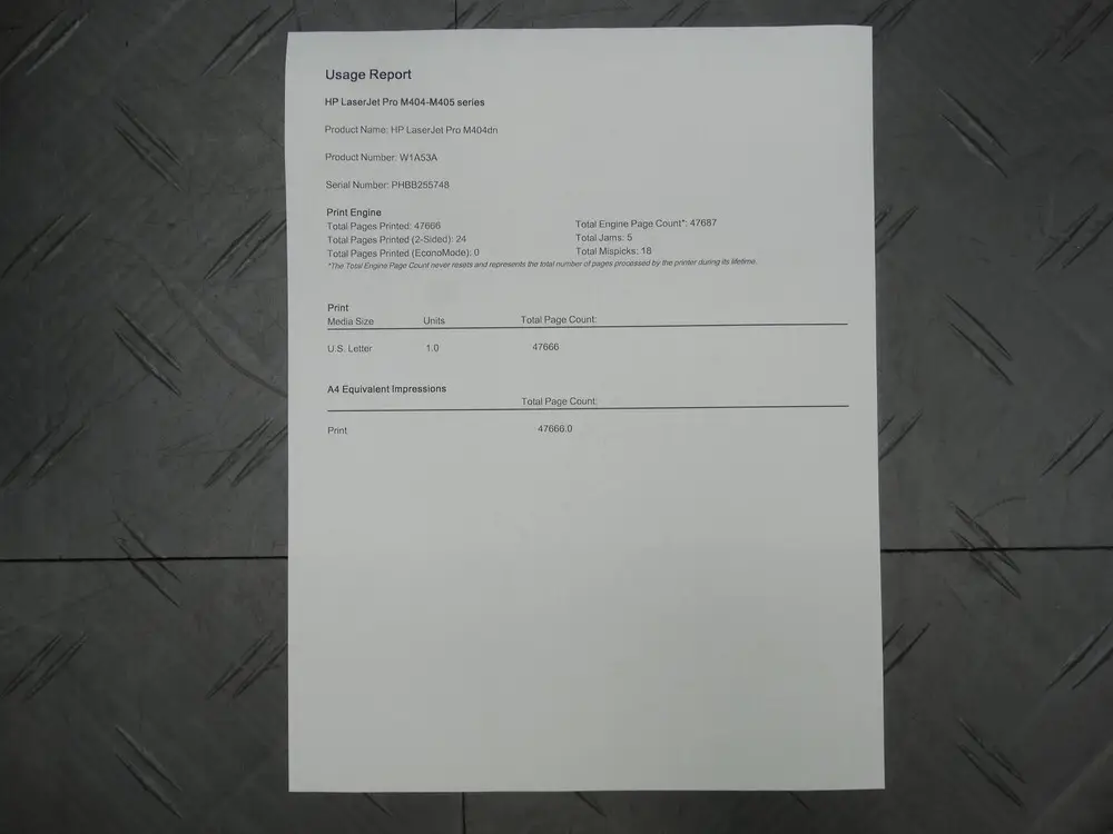 The HP LaserJet Pro M404n is a monochrome laser printer designed for office environments requiring reliable black-and-white printing. It features a high-resolution 1200 x 1200 dpi print output, ensuring crisp, professional-quality documents. The device utilizes a fast print speed of up to 40 pages per minute for efficient workflow. Connectivity options include a standard Gigabit Ethernet port, facilitating seamless network integration. The printer supports various media sizes ranging from A4 to envelopes, with input capacity up to 250 sheets via the main tray and an additional 100-sheet multipurpose tray. Energy-efficient technologies, such as HP Auto-On/Auto-Off, are incorporated to reduce power consumption during idle periods.