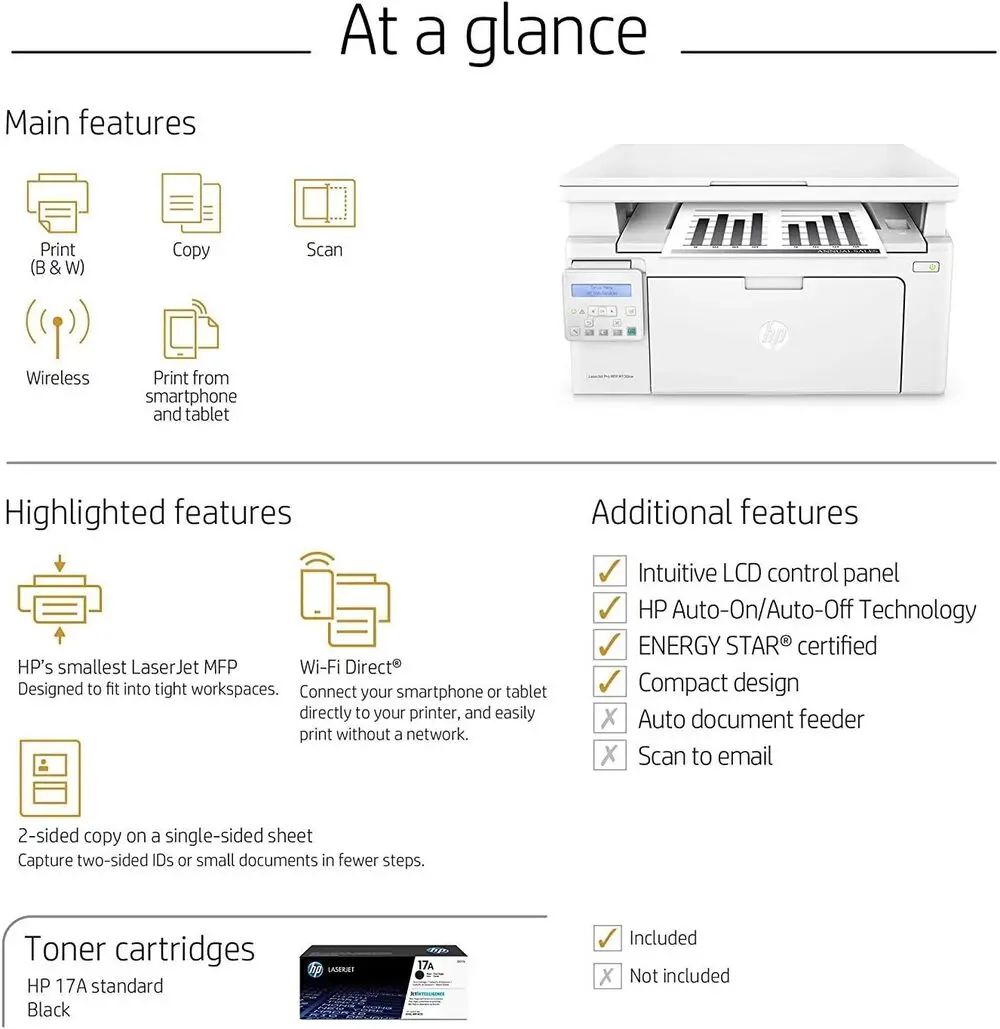 | Included Components | HP LaserJet Imaging Drum, HP LaserJet Pro MFP M130nw, Introductory HP Black LaserJet Toner Cartridge, Power cord, Set up documents and software, USB cable |