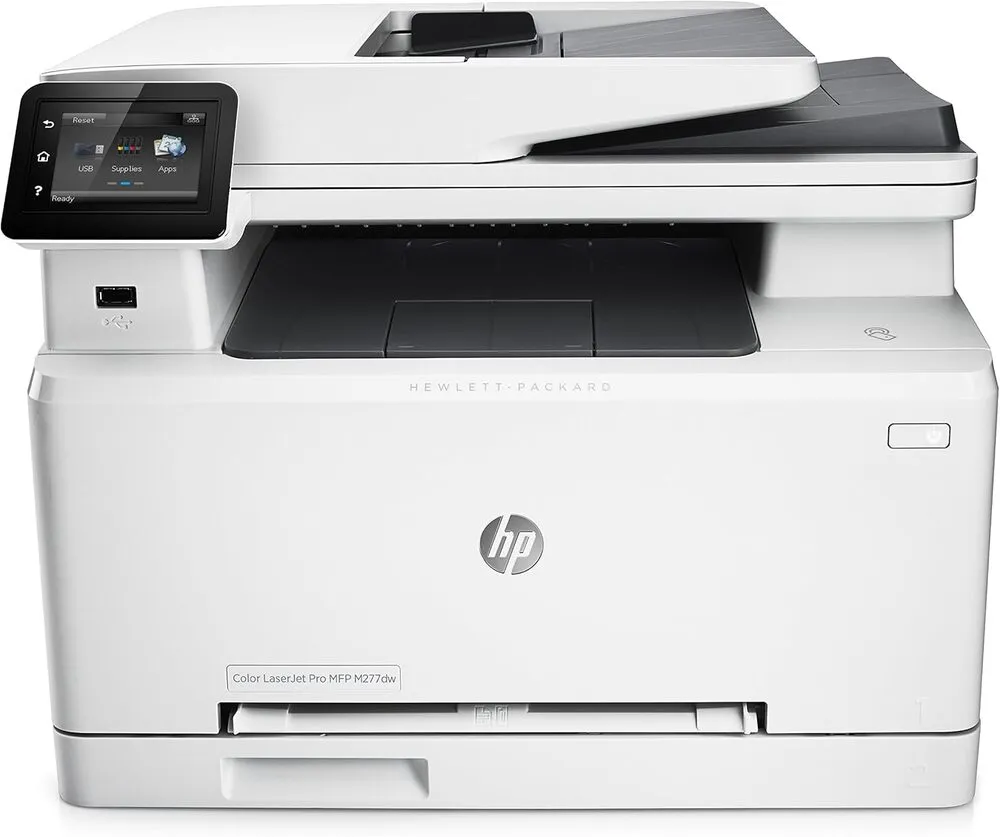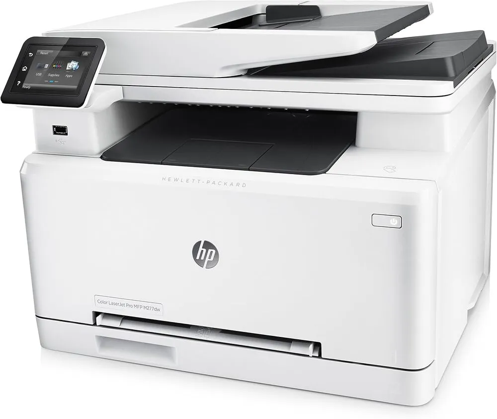 The HP LaserJet Pro M277DW is a multifunction color laser printer designed for efficient office workflows. It offers print, scan, copy, and fax functionalities combined into a compact device. The printer uses HP's proprietary JetIntelligence toner cartridges providing high-quality color output with laser precision. Connectivity options include wireless, Ethernet, and USB ports, facilitating seamless integration into various office networks. The 2.7-inch color touchscreen simplifies navigation and operation, supporting mobile printing through HP ePrint, Apple AirPrint, and Google Cloud Print. It supports print speeds up to 19 pages per minute for black and color documents and delivers resolutions up to 600 x 600 dpi (enhanced to 1200 dpi technology).