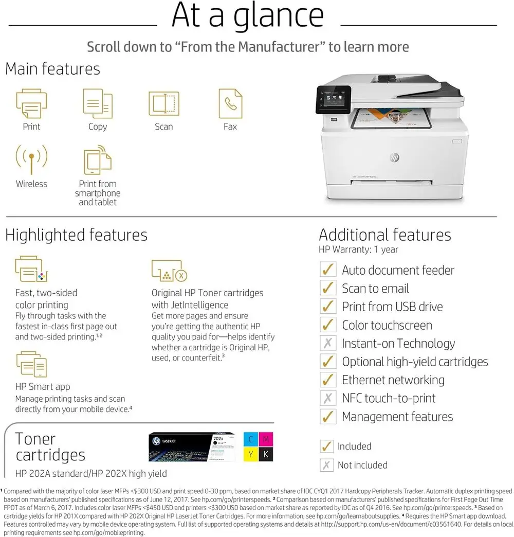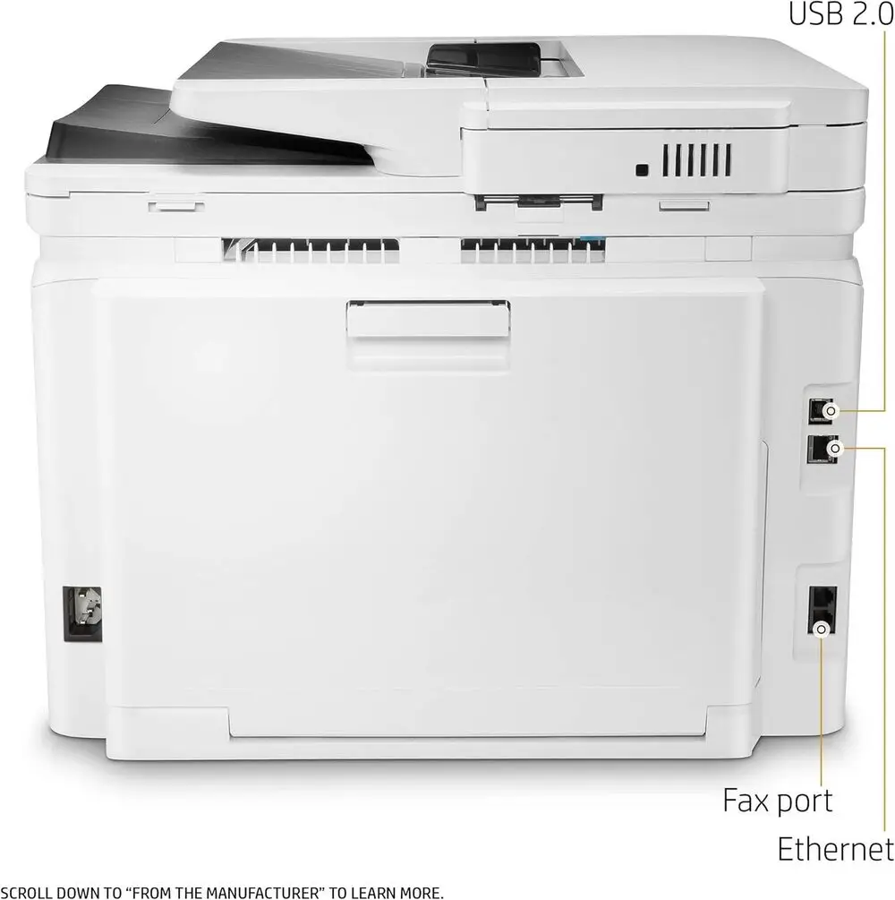The HP LaserJet Pro M281fdw offers high-quality color laser prints with sharp text and vivid color graphics.