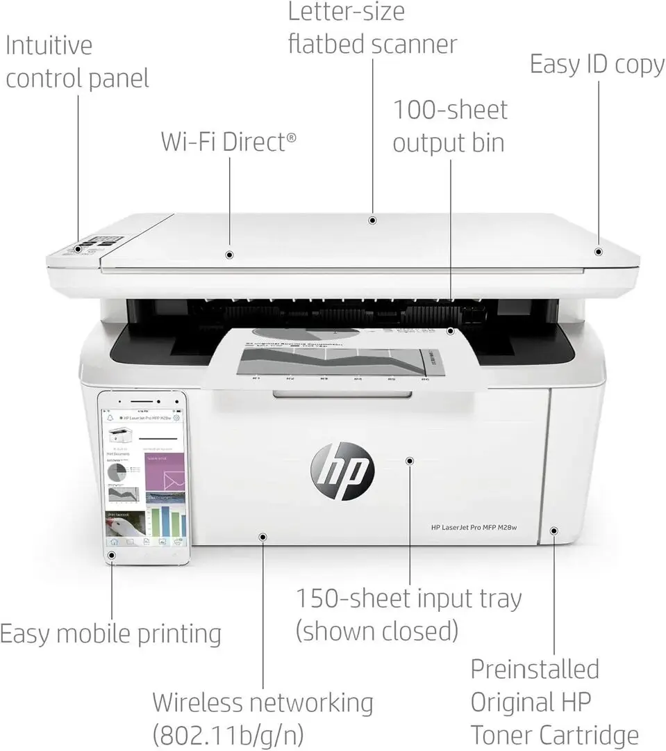 The HP LaserJet Pro M28W offers fast print speeds that improve office productivity significantly. Wireless connectivity options including Wi-Fi make it convenient to print from multiple devices without cables. Its compact, lightweight design fits easily into small workspaces. The printer supports mobile printing technologies for ease of use on smartphones and tablets. It consumes relatively low power during operation, making it energy efficient. Maintenance is straightforward with user-friendly controls and easy cartridge replacement.
