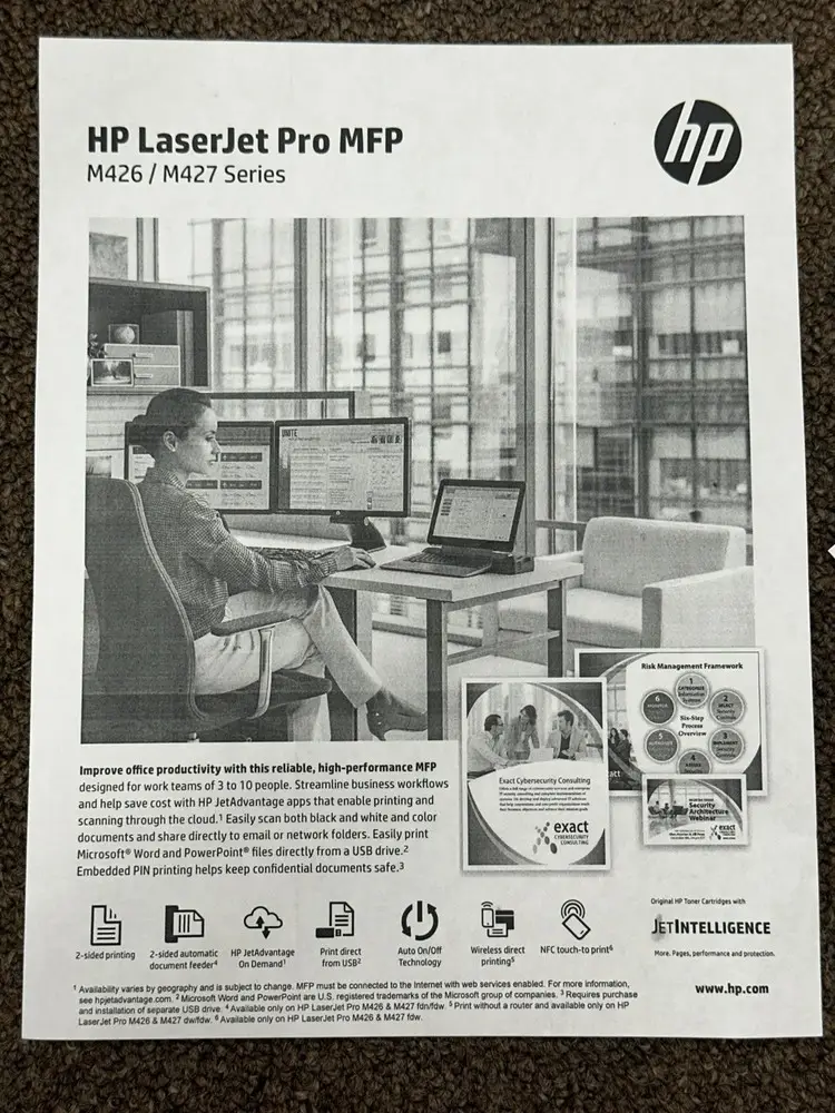 The HP M426fdn offers fast printing speeds up to 38 ppm, significantly improving office productivity.