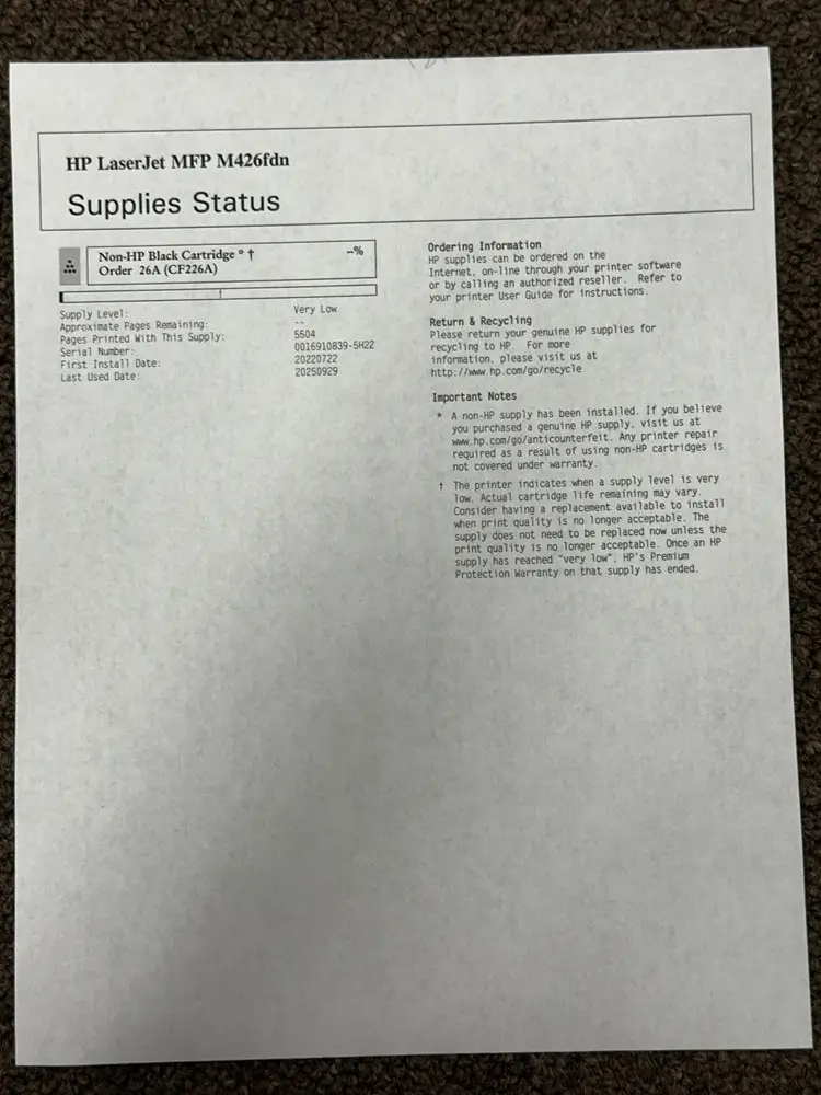The device uses HP 26A (CF226A) Black Original LaserJet Toner Cartridge specifically designed for this printer.
