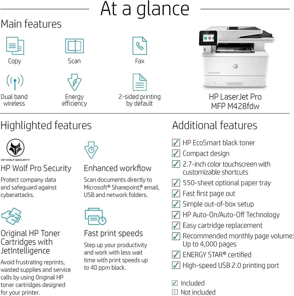 The HP LaserJet Pro MFP M428fdw is a multifunction monochrome laser printer designed for office environments, incorporating printing, scanning, copying, and faxing capabilities. It utilizes a 1200 x 1200 dpi resolution for sharp text and graphics output, supported by a 40 ppm print speed. The device is powered by a dual-core processor for efficient document processing and features a 250-sheet input tray with an automatic document feeder (ADF) for streamlined workflows. Connectivity options include USB 2.0, Ethernet, and wireless networking, allowing versatile deployment in various office setups. Additionally, it supports mobile printing technologies such as Apple AirPrint and HP ePrint for convenient remote operation.