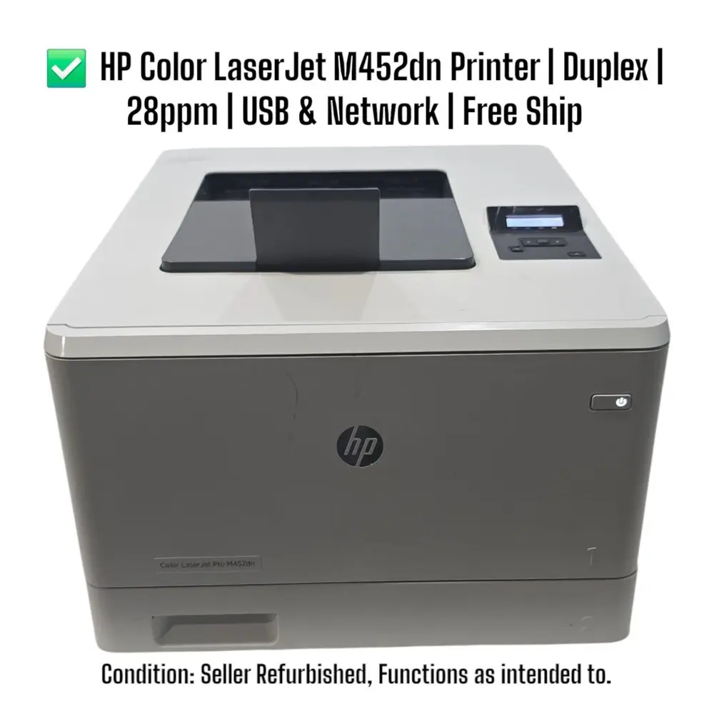 The HP LaserJet Pro M452dn is a monochrome laser printer designed for office environments.