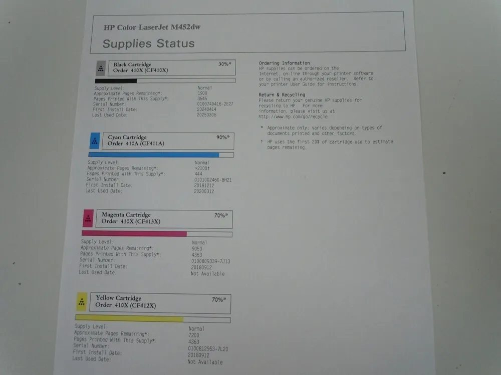 The printer uses HP 412A toner cartridges, including model numbers CF392A (black), CF393A (cyan), CF394A (yellow), and CF395A (magenta).