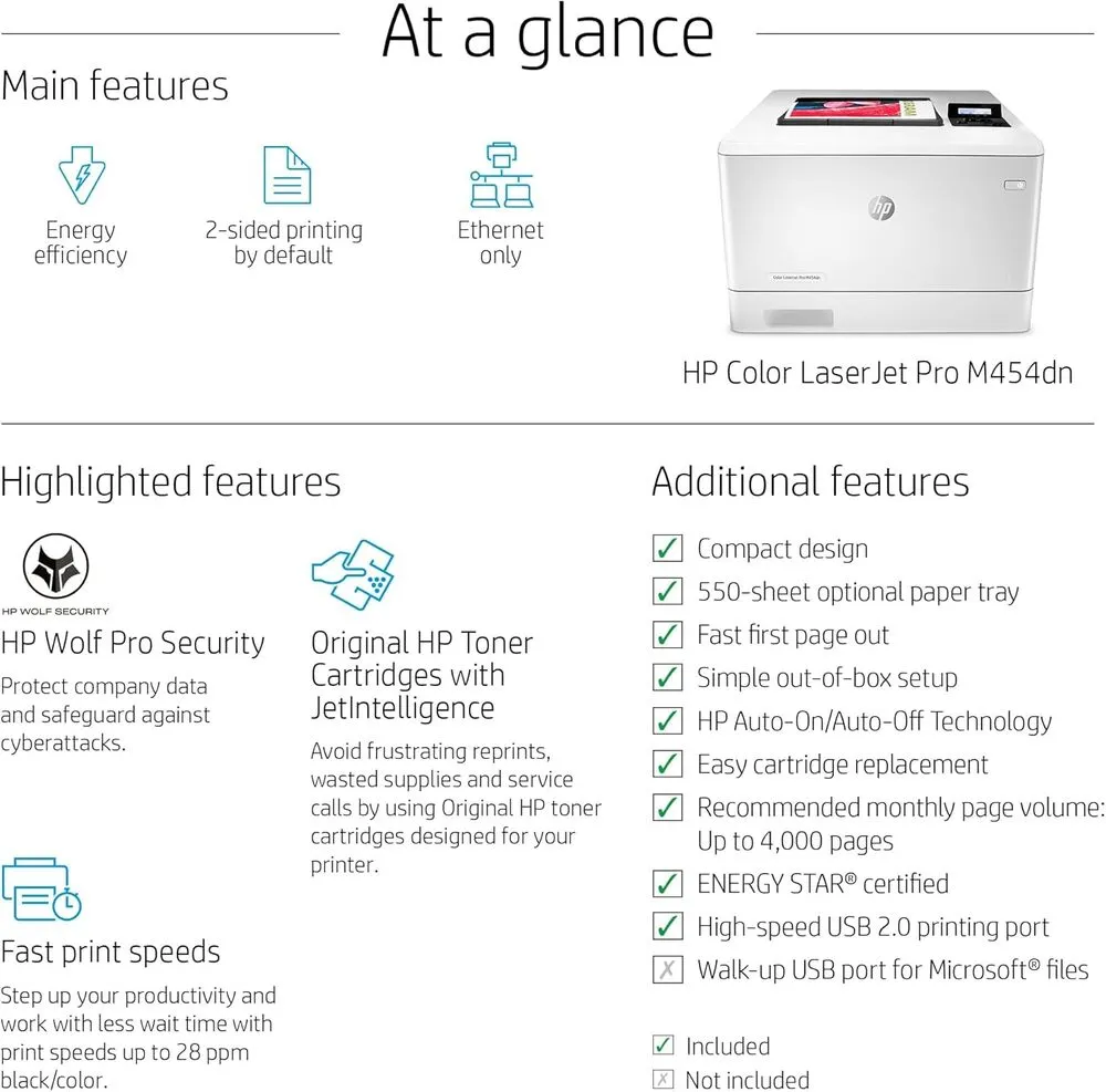 The HP LaserJet Pro M454DN offers fast print speeds that enhance office productivity. It supports automatic duplex printing, saving paper and reducing operational costs. The intuitive 2.7-inch color touchscreen makes printer management accessible and user-friendly. Its robust connectivity options, including Ethernet and USB, provide flexible network integration. The high print resolution ensures sharp and crisp document output suitable for professional use. A strong security feature set protects sensitive data and restricts unauthorized access, making it ideal for business environments.