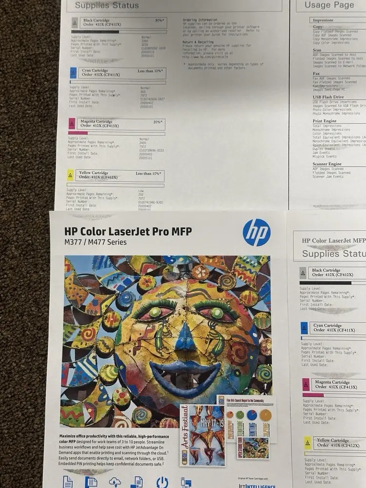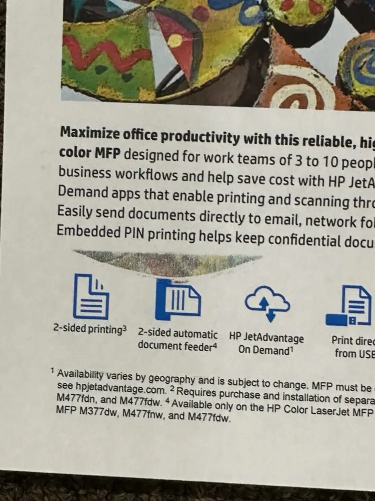 The HP M477fdn prints up to 28 pages per minute in both color and black and white.