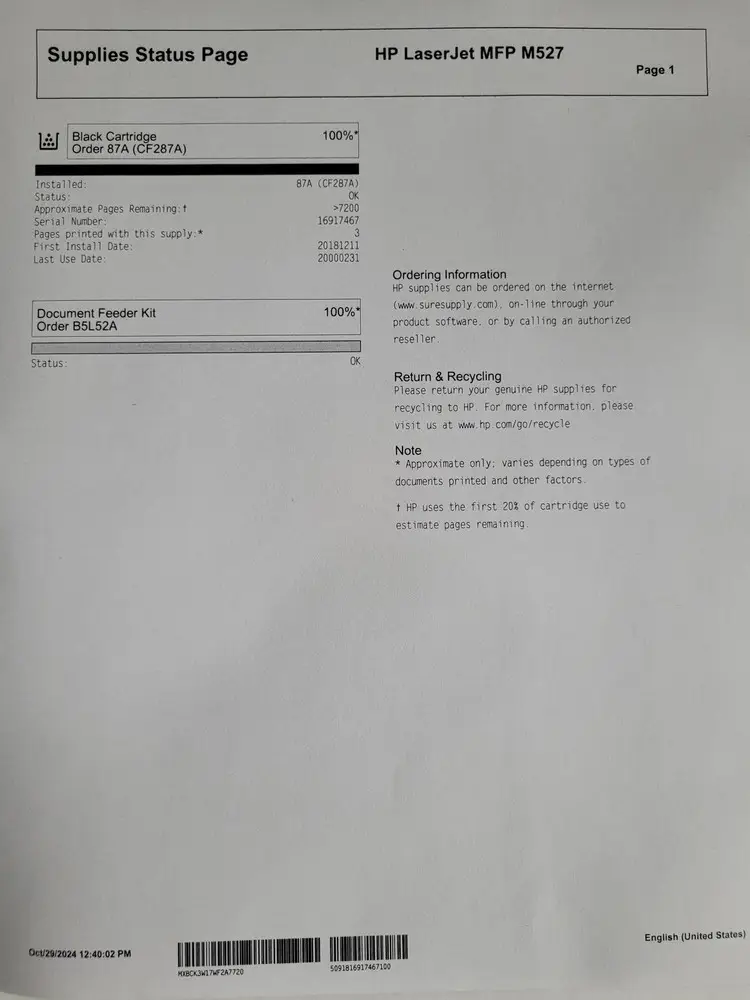 The HP M527f provides rapid printing speeds of up to 40 ppm, minimizing wait times in busy offices. Its all-in-one functionality combined with a 50-sheet ADF enhances productivity by streamlining document workflows. Automatic duplexing reduces paper consumption and operating costs. Multiple connectivity options including mobile printing support improve user convenience and flexibility. Advanced security measures safeguard business data, ensuring compliance with corporate policies. The device's compatibility with high-yield cartridges lowers maintenance frequency and cost.
